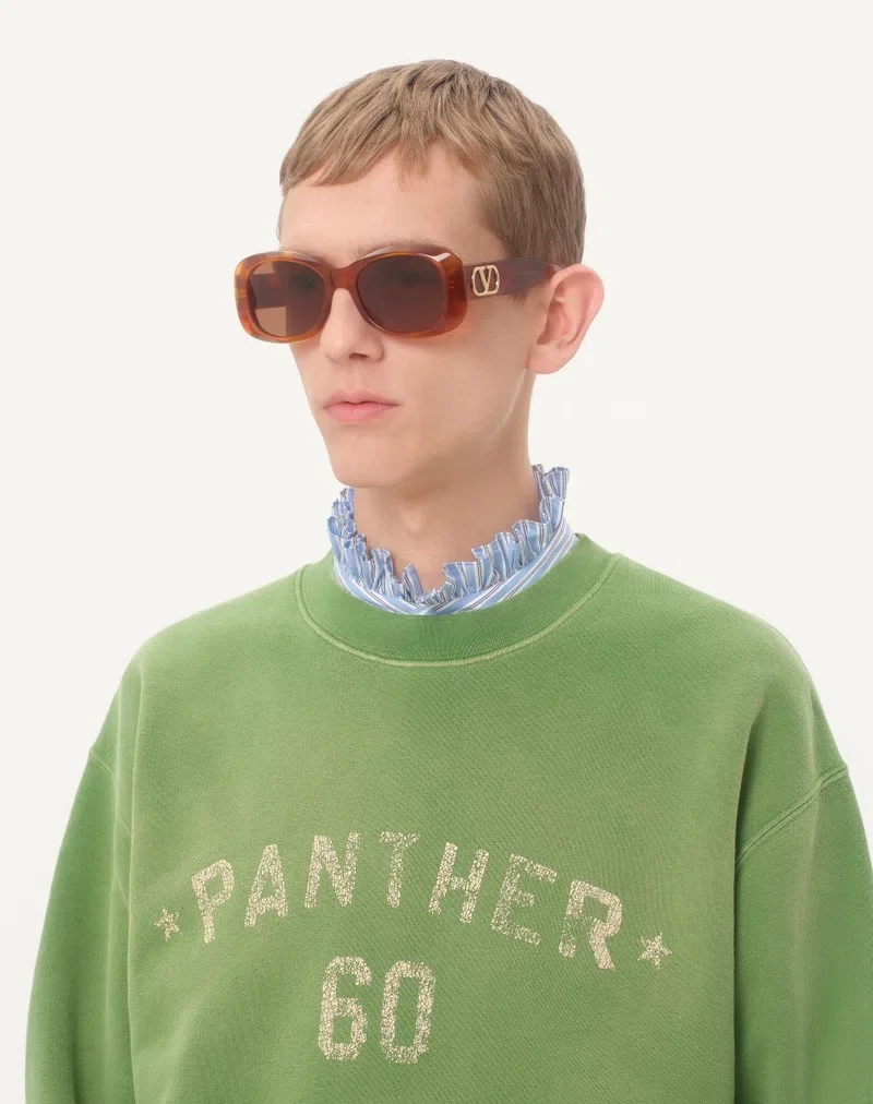 A retro-chic rectangular frame, as bold as it is feminine. This model is elegantly constructed from a sturdy, thick acetate, milled to achieve greater dimensionality, reducing its weight without compromising on volume, ensuring timeless beauty. The rectangular 1970s eyewear, as ingenious as it is beautiful, also features an oversized variant of the iconic VLogo, mechanically applied to the temples for precise visibility and an extraordinary visual impact. Elegant, sensual, and designed with comfort and everyday use in mind.