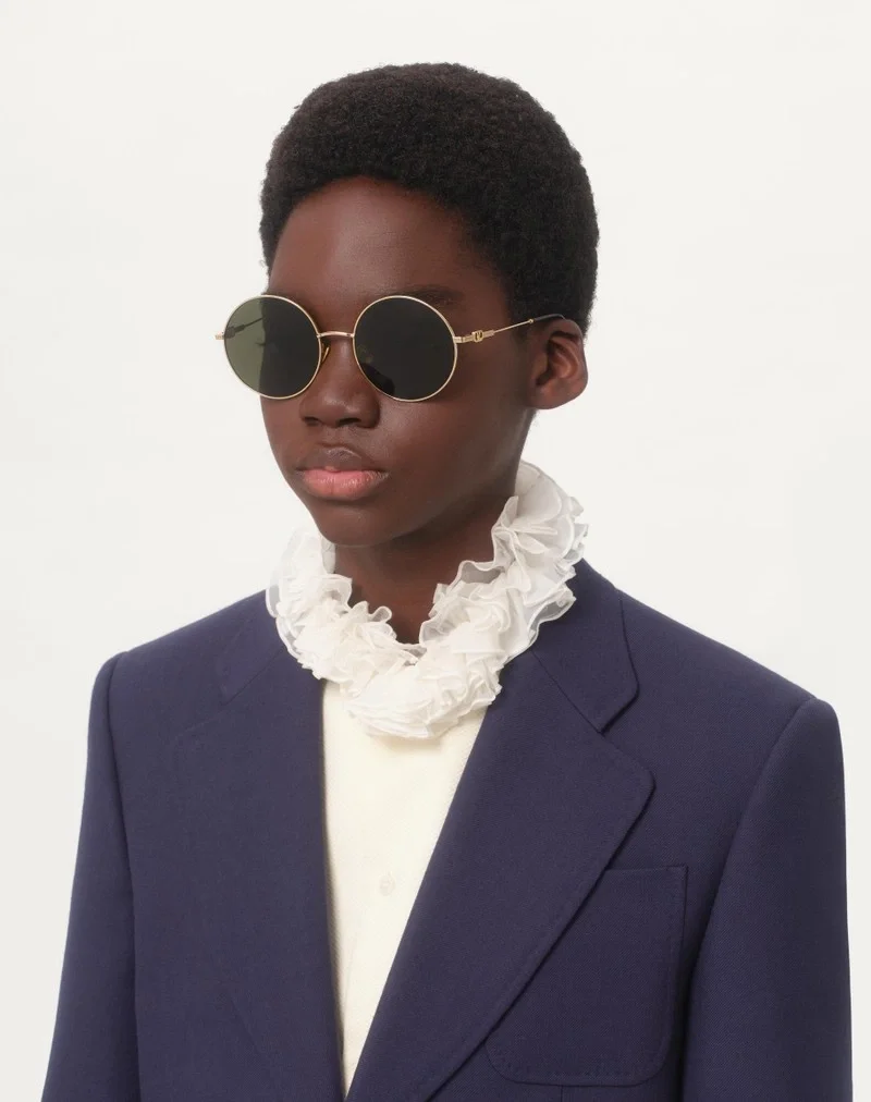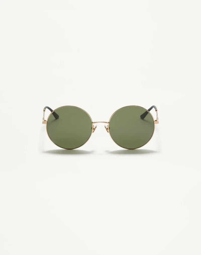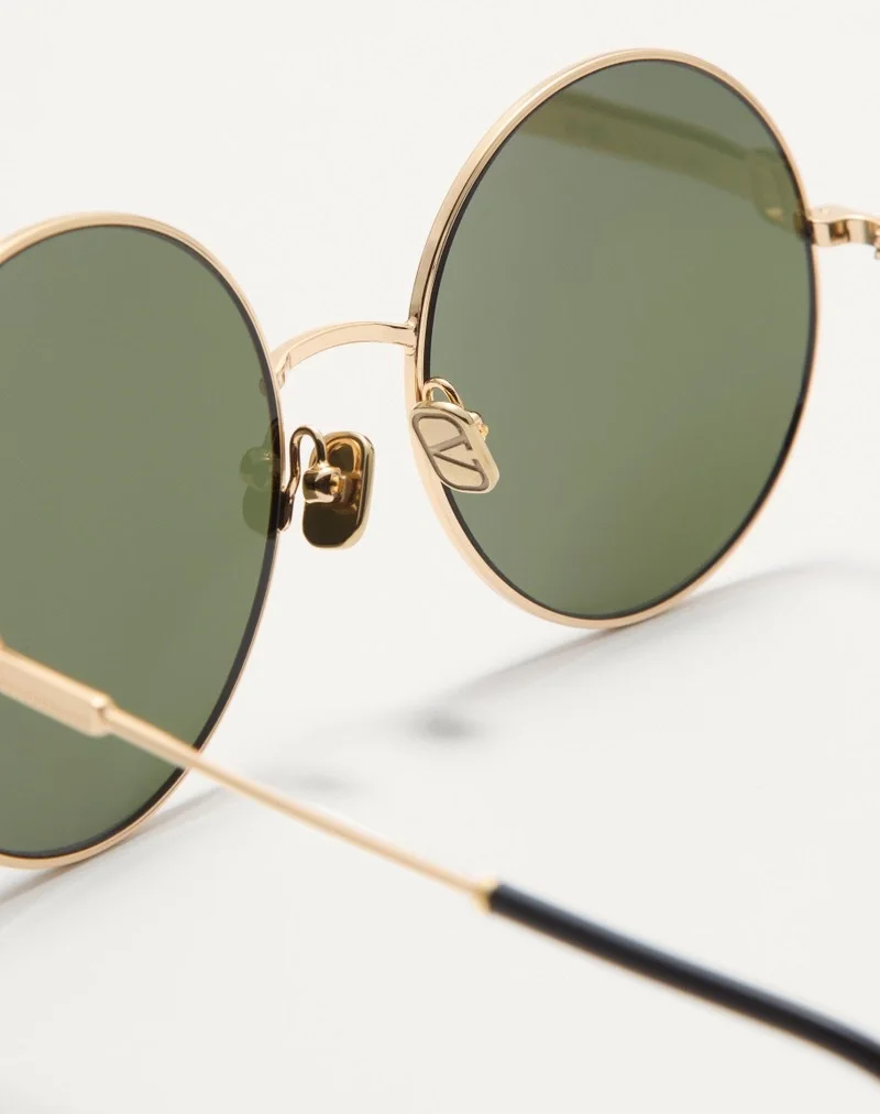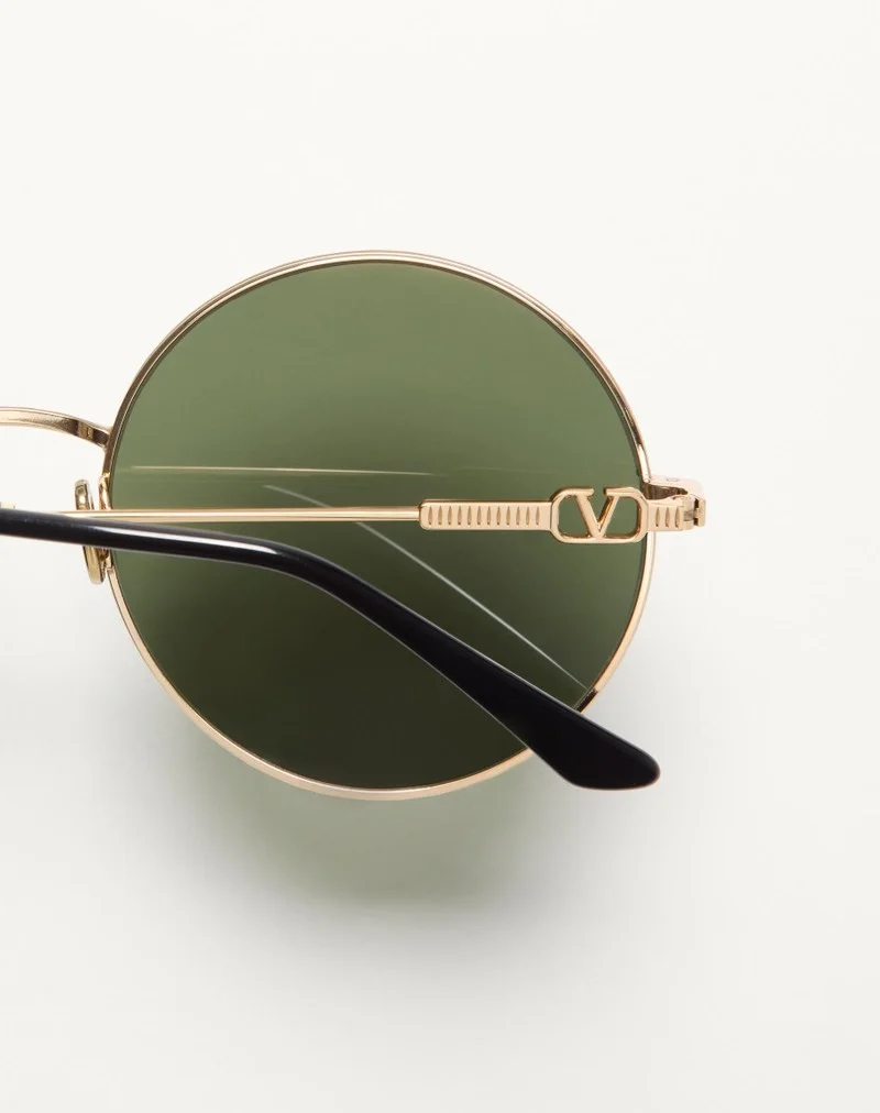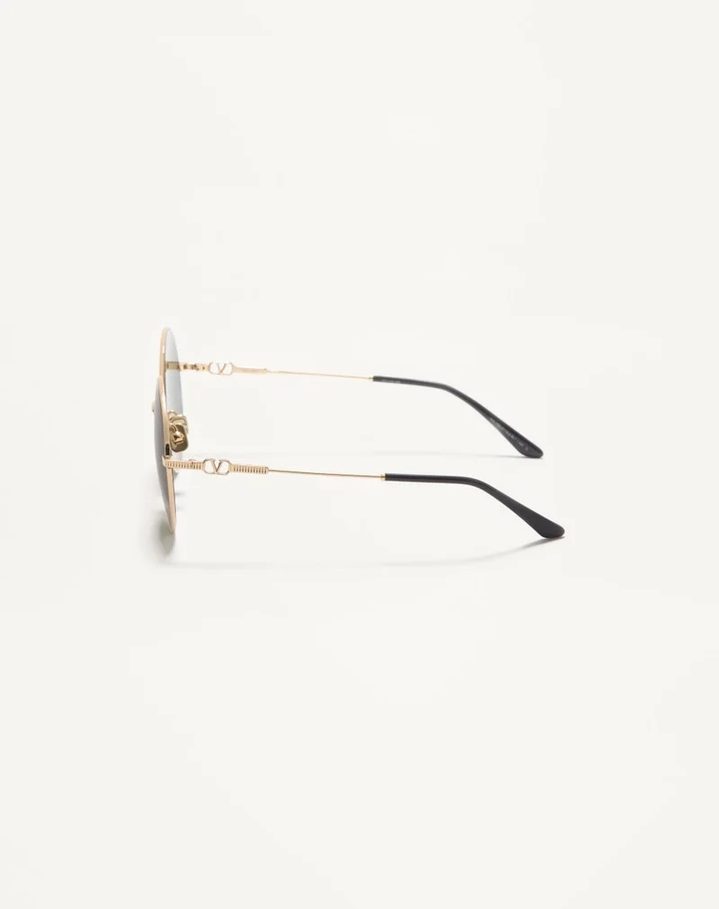 Light gold round oversized metal shape with subtle V-logo set in decorated knurled endpiece
