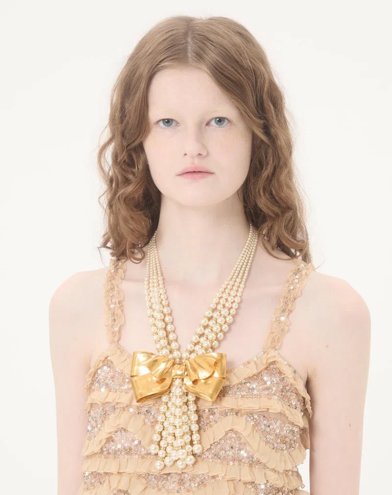 - Strands of graduated and butter-colored glass pearls with crystal details