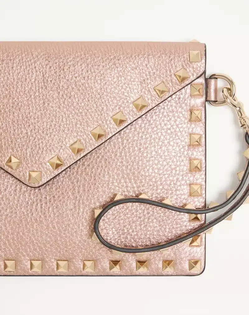 Valentino Garavani Rockstud clutch bag in laminated grainy calfskin.