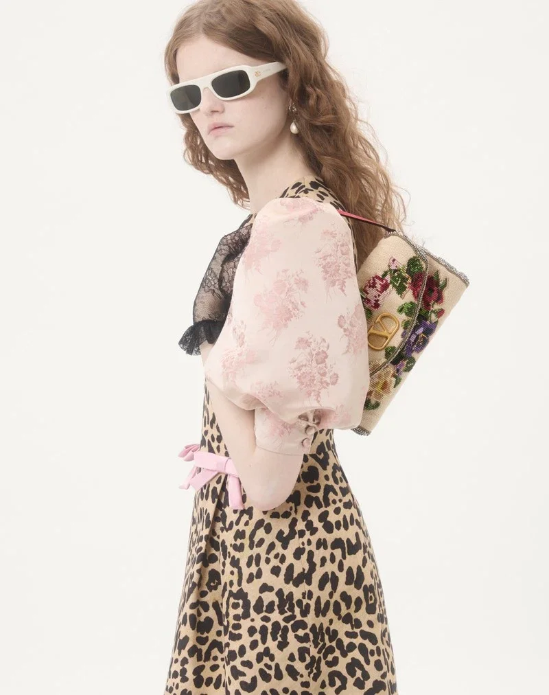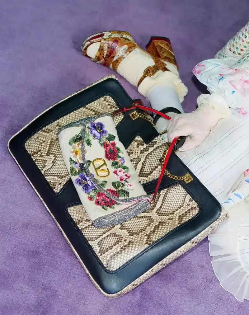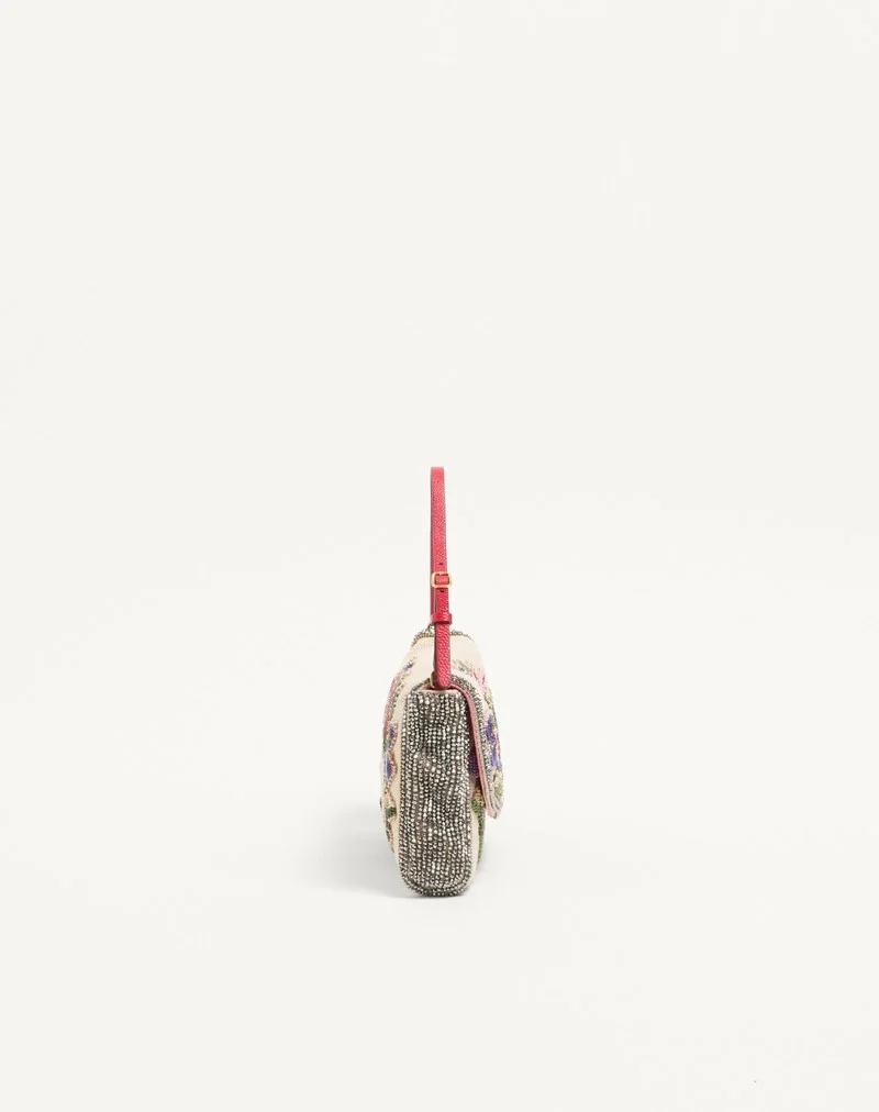 Valentino Garavani DeVain small shoulder bag in linen with floral beaded embroidery and metallic VLogo Signature detail. The bag can be carried by hand or worn over the shoulder.