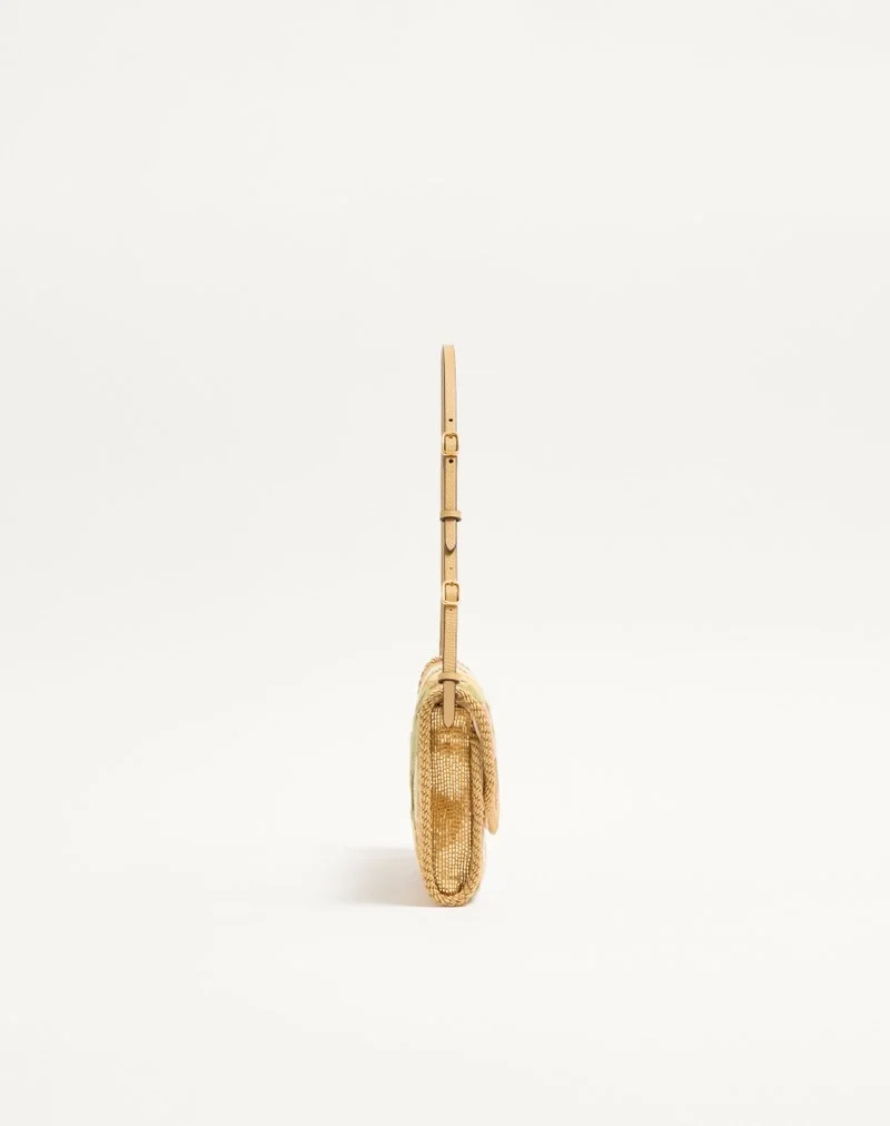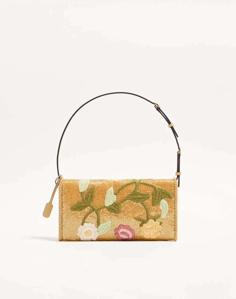 Valentino Garavani DeVain small shoulder bag with floral embroidery on a beaded base with metallic VLogo Signature detail. The bag can be carried by hand or over the shoulder.