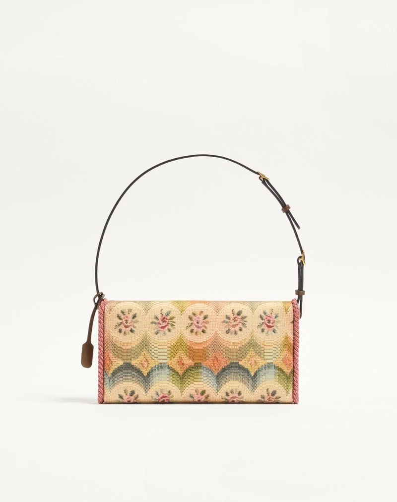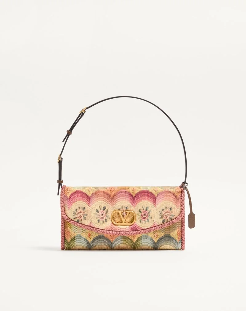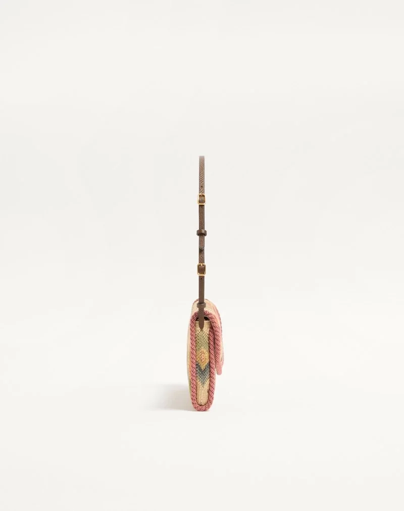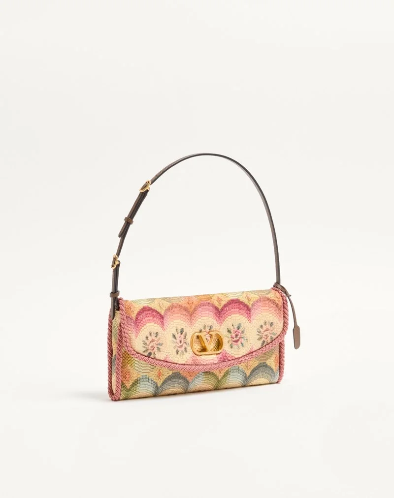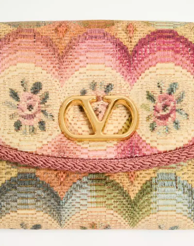 Valentino Garavani DeVain small shoulder bag in jacquard fabric with Apres L’Hiver motif and metallic VLogo Signature element. The bag can be carried by hand or over the shoulder.