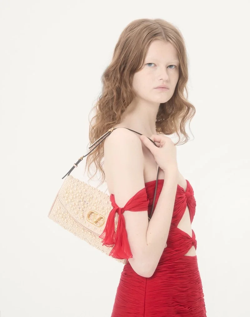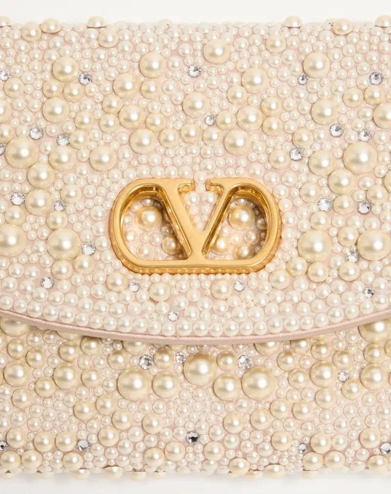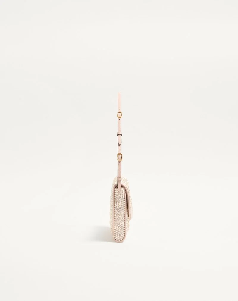 Valentino Garavani DeVain small shoulder bag with pearls and rhinestones and metallic VLogo Signature element. The bag can be carried by hand or over the shoulder.