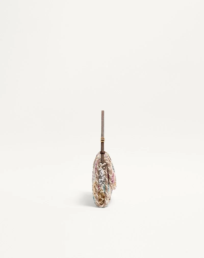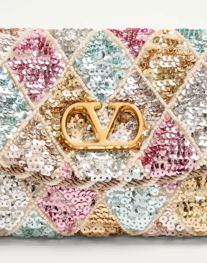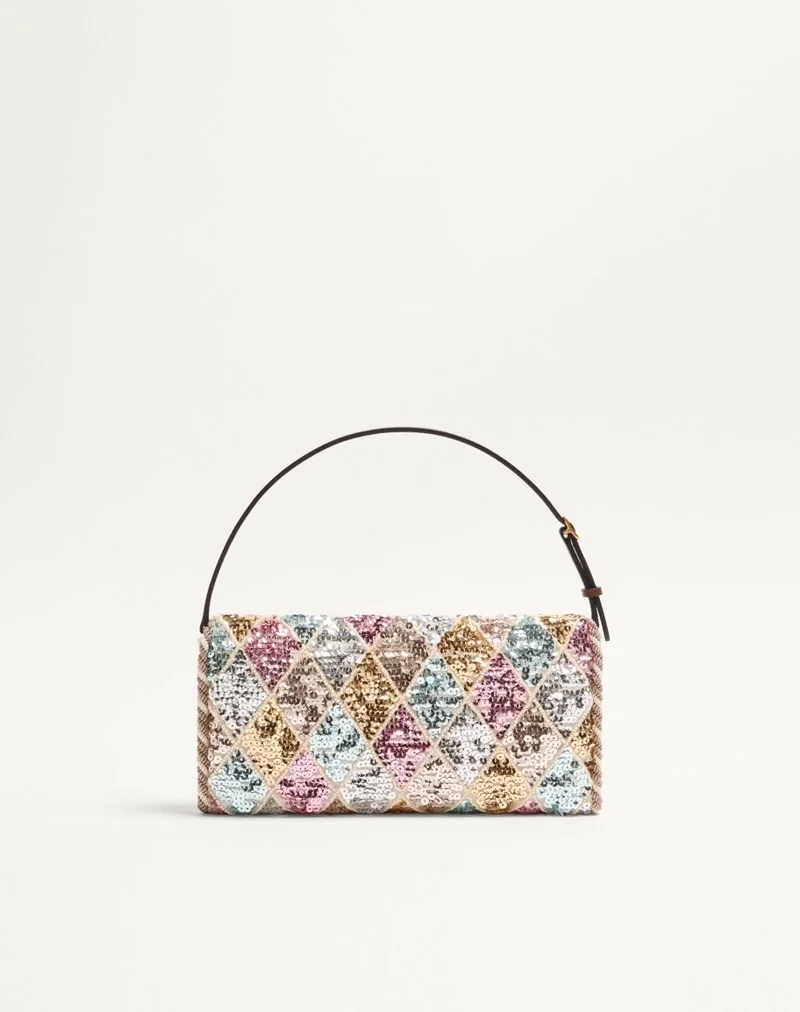 Valentino Garavani DeVain small shoulder bag with Rhombelle sequin embroidery and metallic VLogo Signature detail. The bag can be carried by hand or worn over the shoulder.