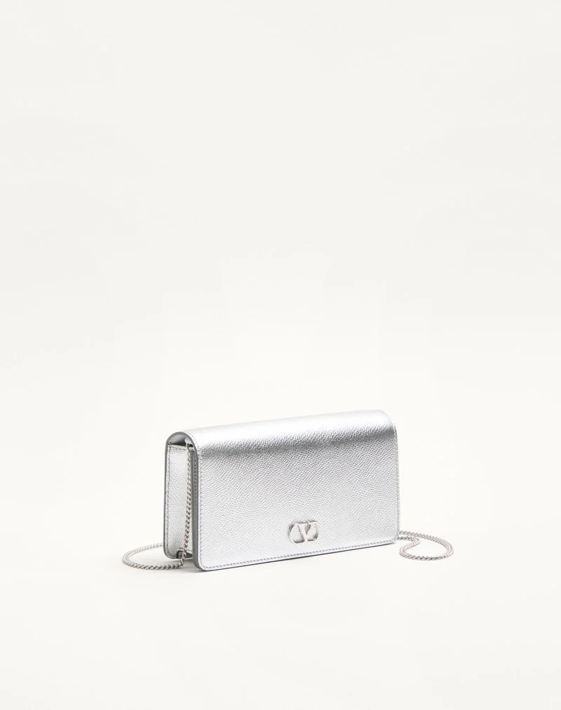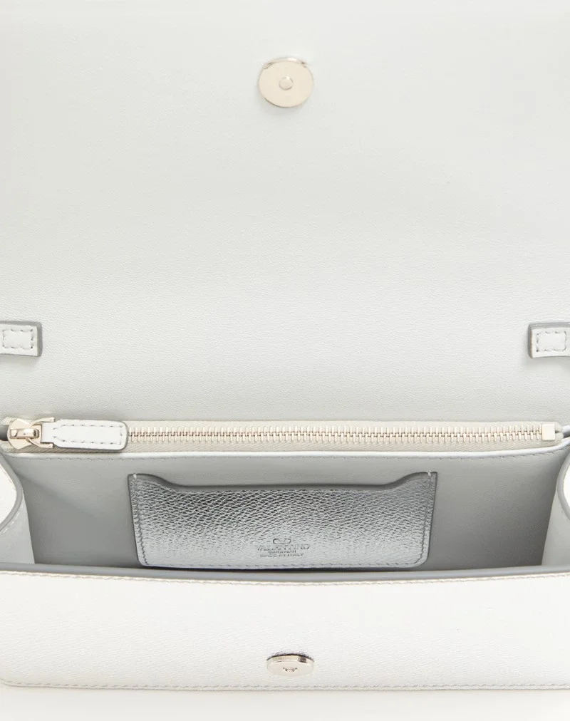 Valentino Garavani VLogo Signature mini shoulder bag in laminated grainy calfskin. The chain allows this bag to be worn over the shoulder or crossbody. – Magnetic button closure