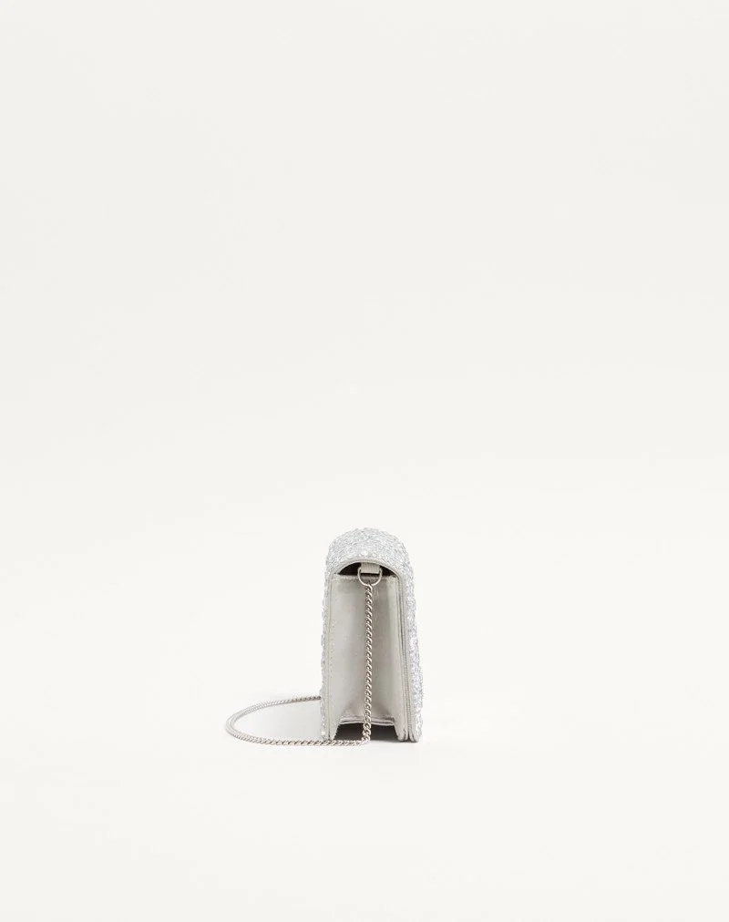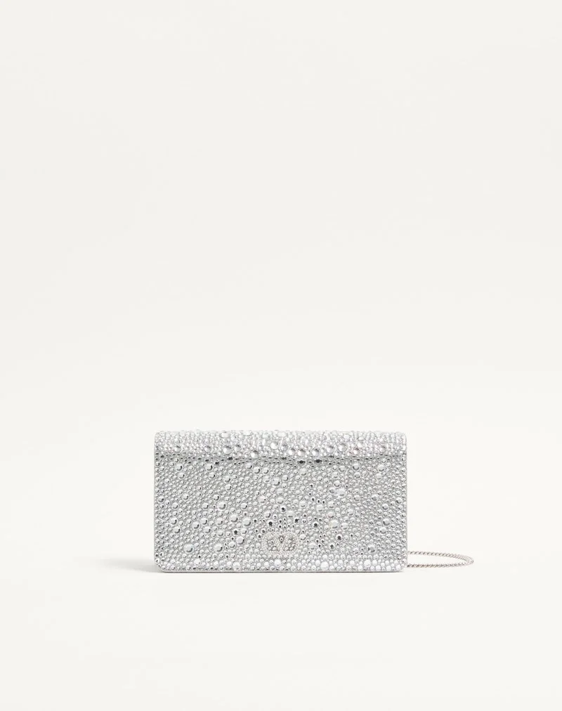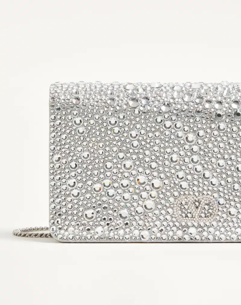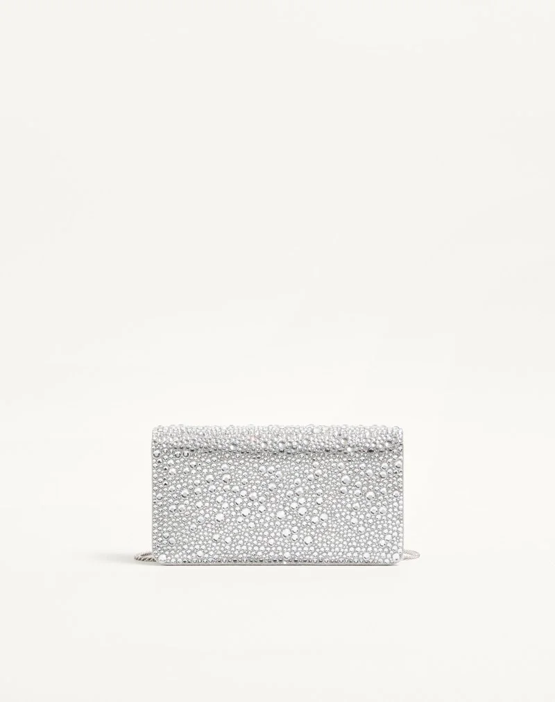 Valentino Garavani Vlogo Signature mini shoulder bag entirely covered in Swarovski® crystals. The chain allows this bag to be worn over the shoulder or crossbody. – Magnetic button closure