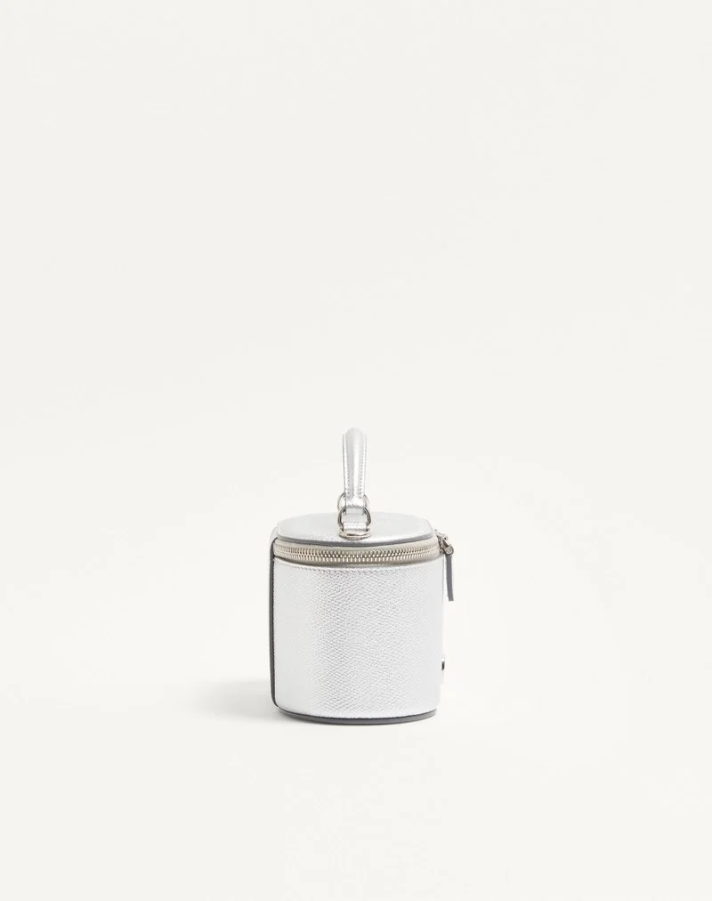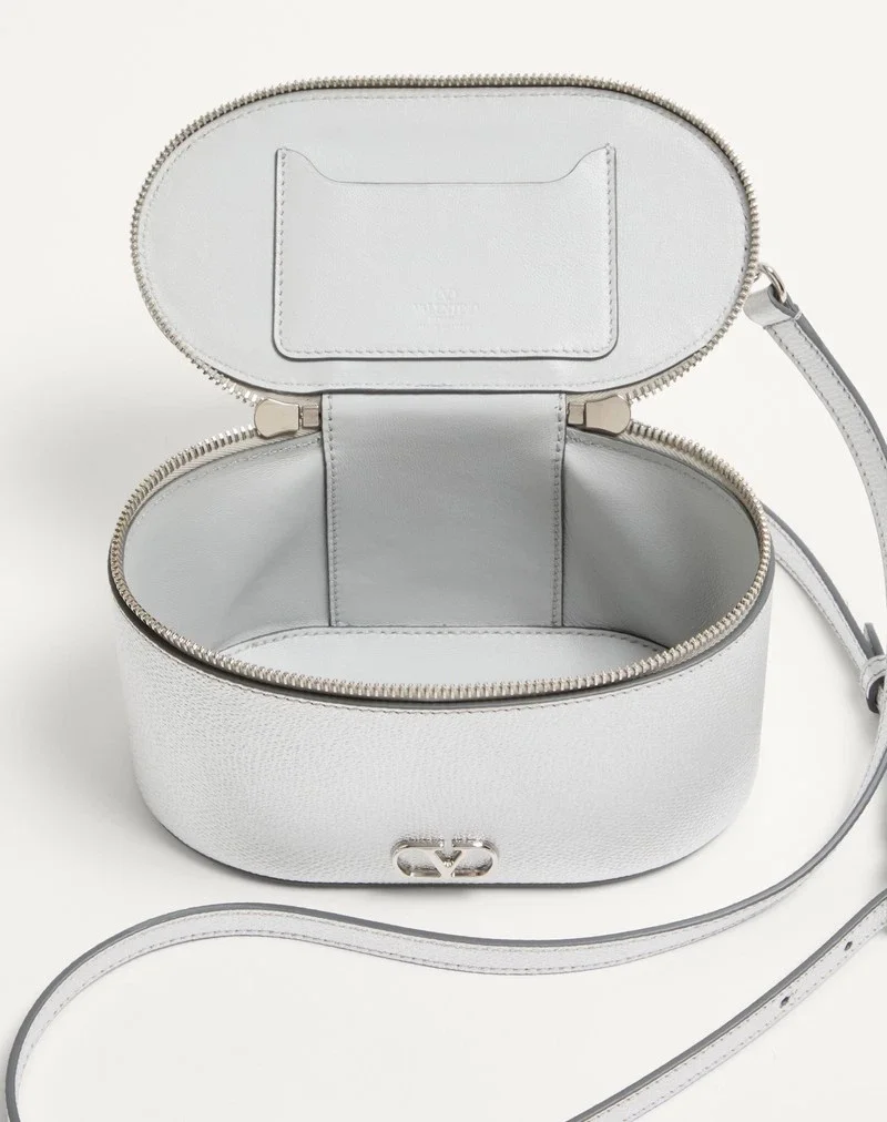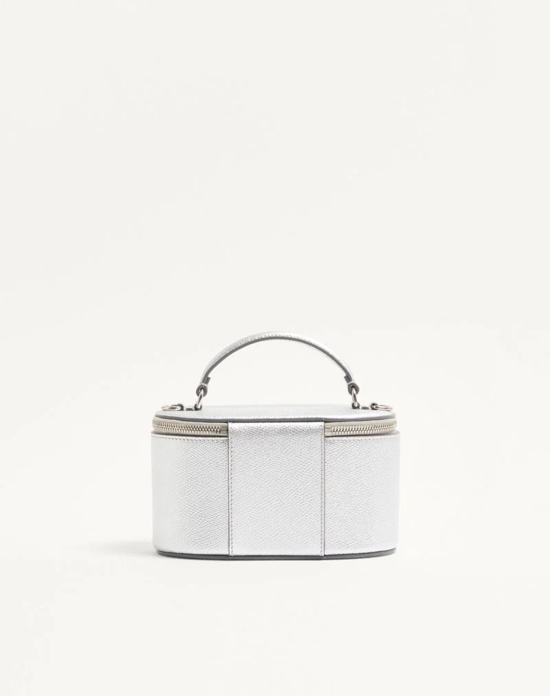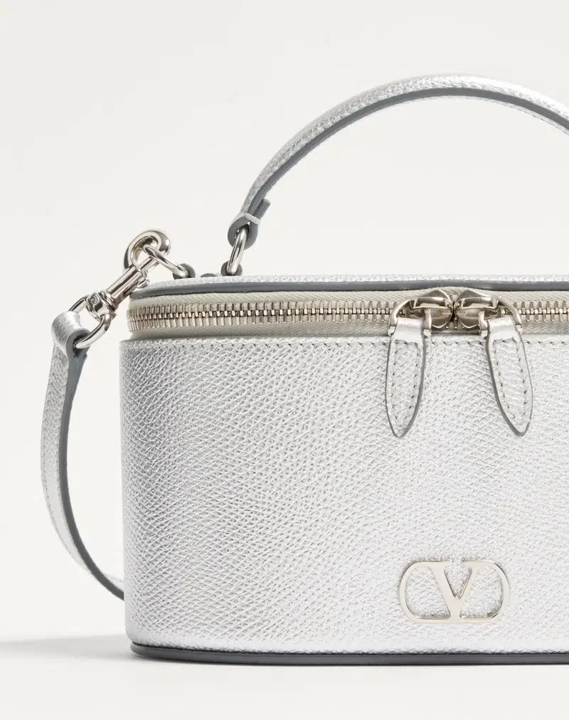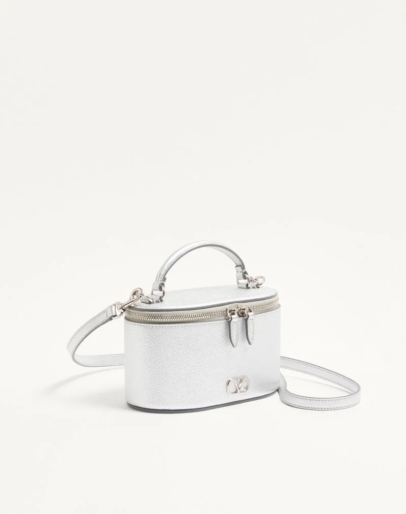Valentino Garavani VLogo Signature mini vanity bag in laminated grainy calfskin. It can be worn over the shoulder/crossbody or carried as a handbag thanks to the handle and the adjustable and removable shoulder strap.