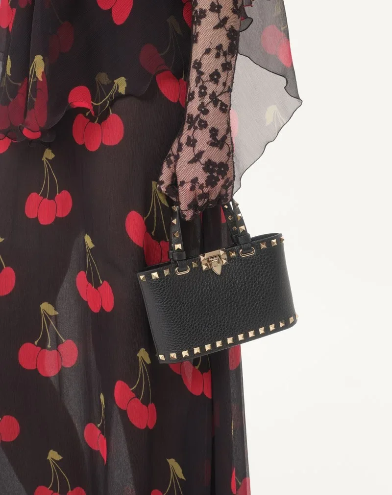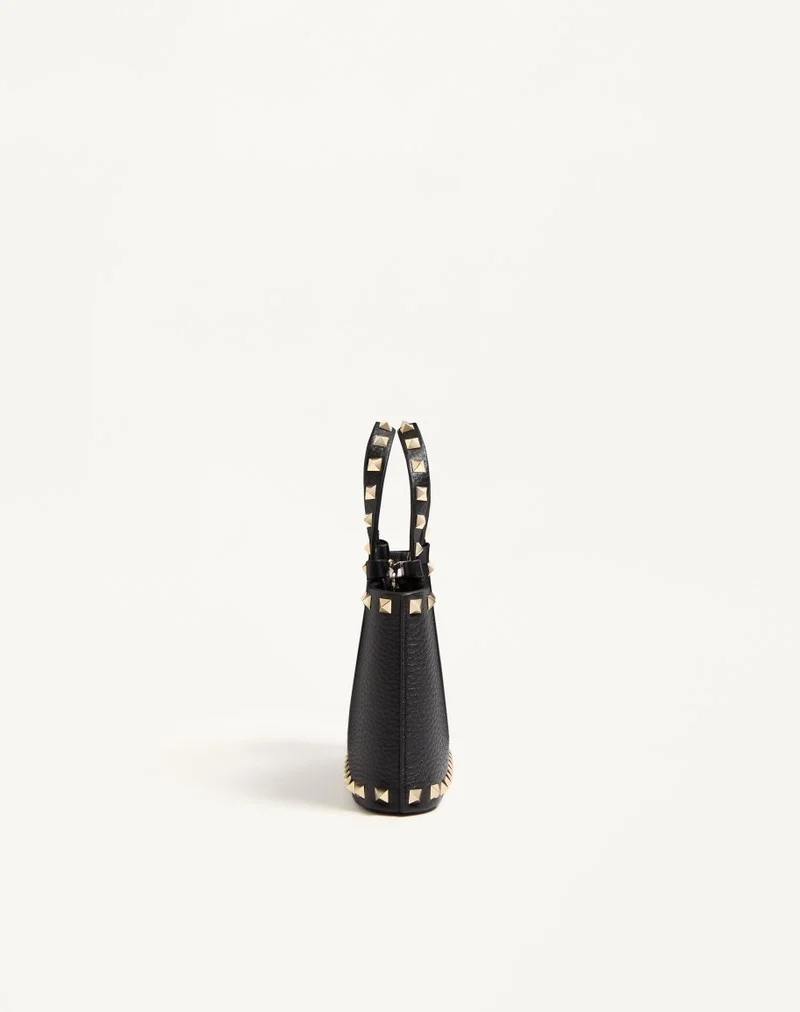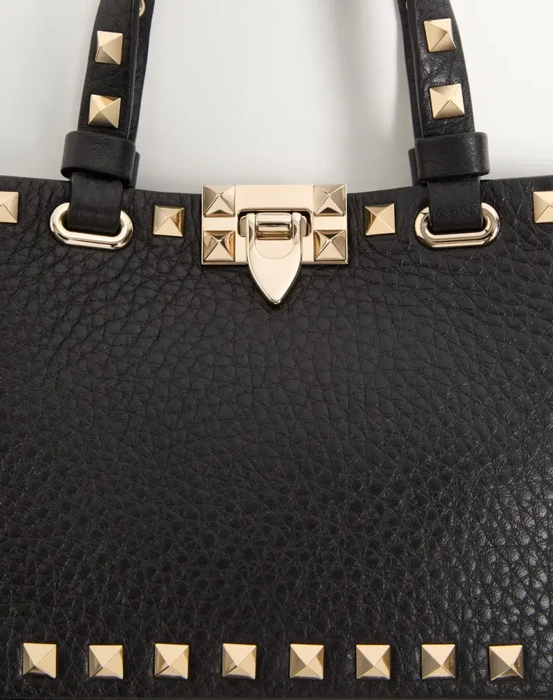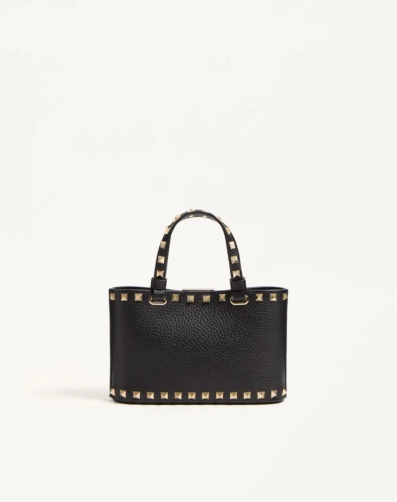 Valentino Garavani Rockstud mini shopping bag in grainy calfskin. The bag may be handheld or worn over the shoulder/crossbody thanks to the handles and the detachable chain.