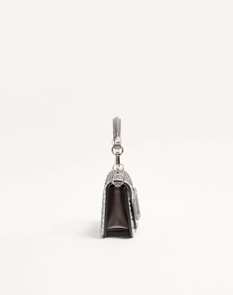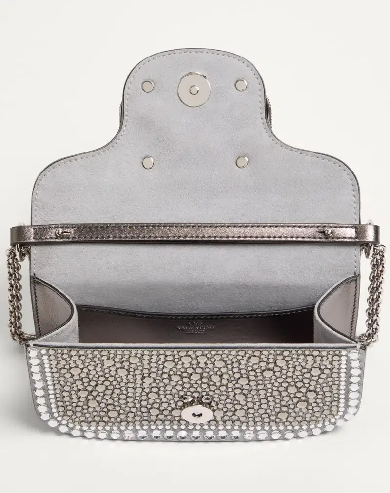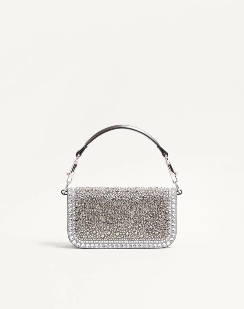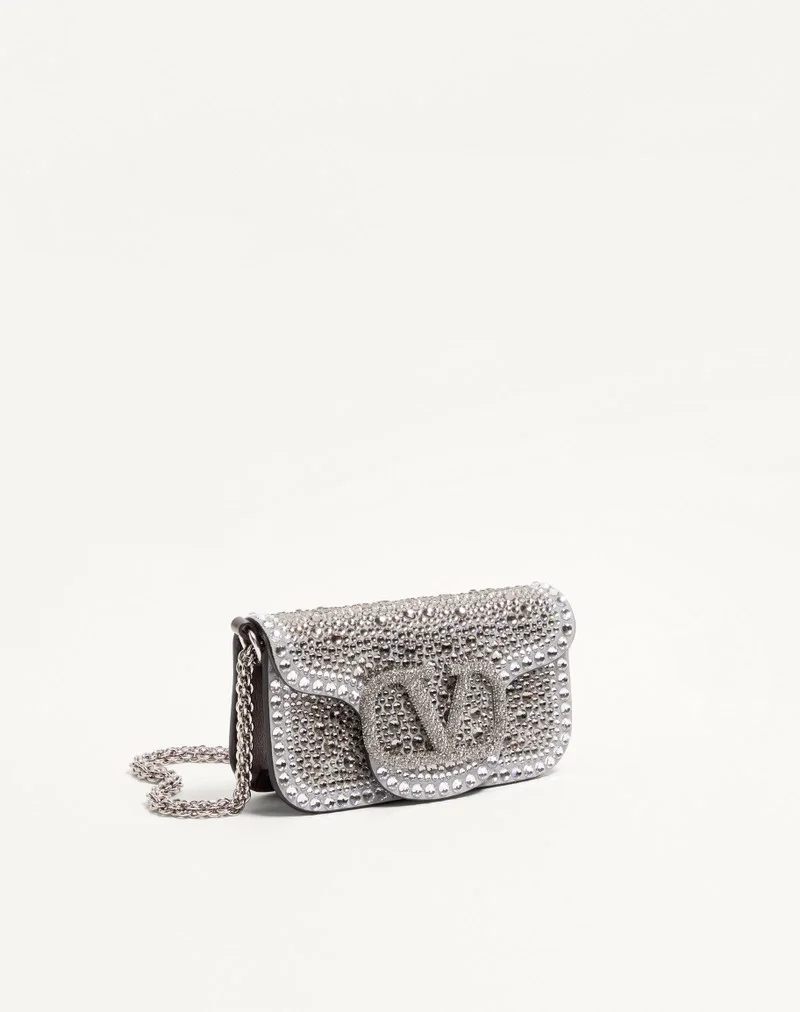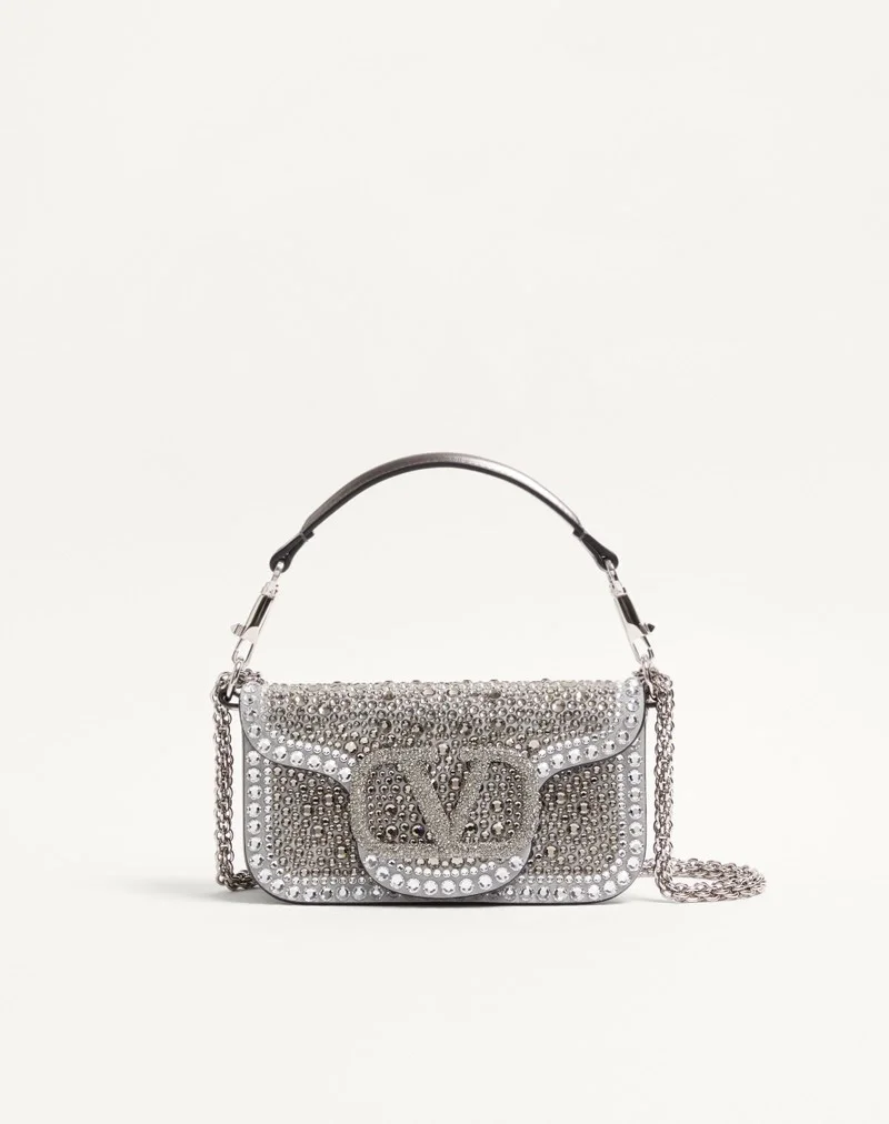 Valentino Garavani Locò small shoulder bag with rhinestone appliqué and Swarovski® covered VLogo Signature element. Equipped with both a detachable sliding chain strap and a detachable handle, this accessory can be worn as a crossbody/shoulder bag or carried as a handbag.