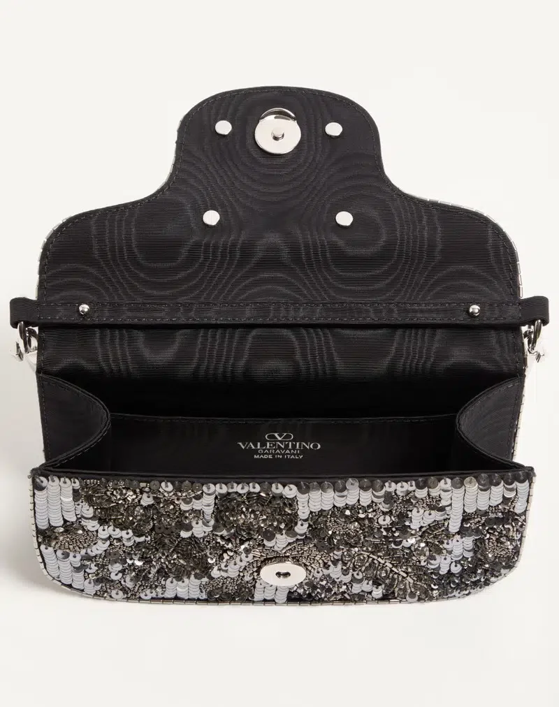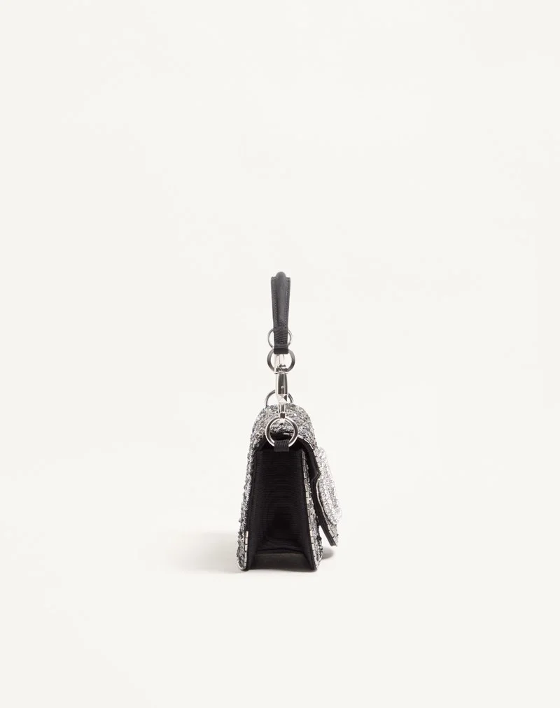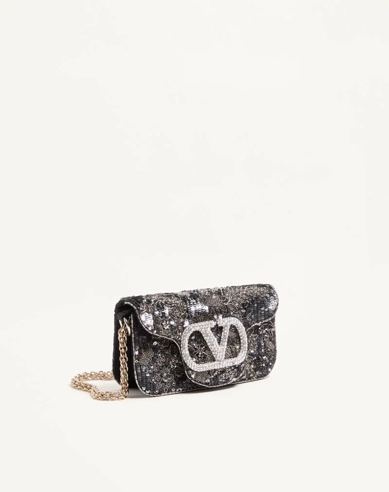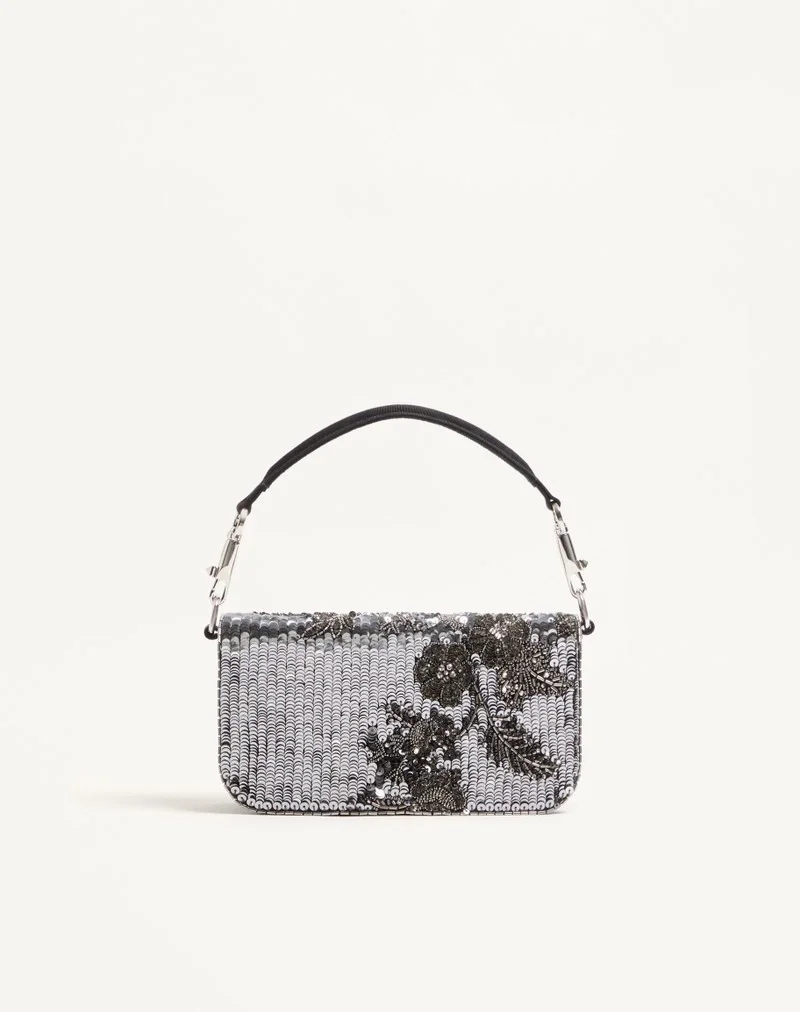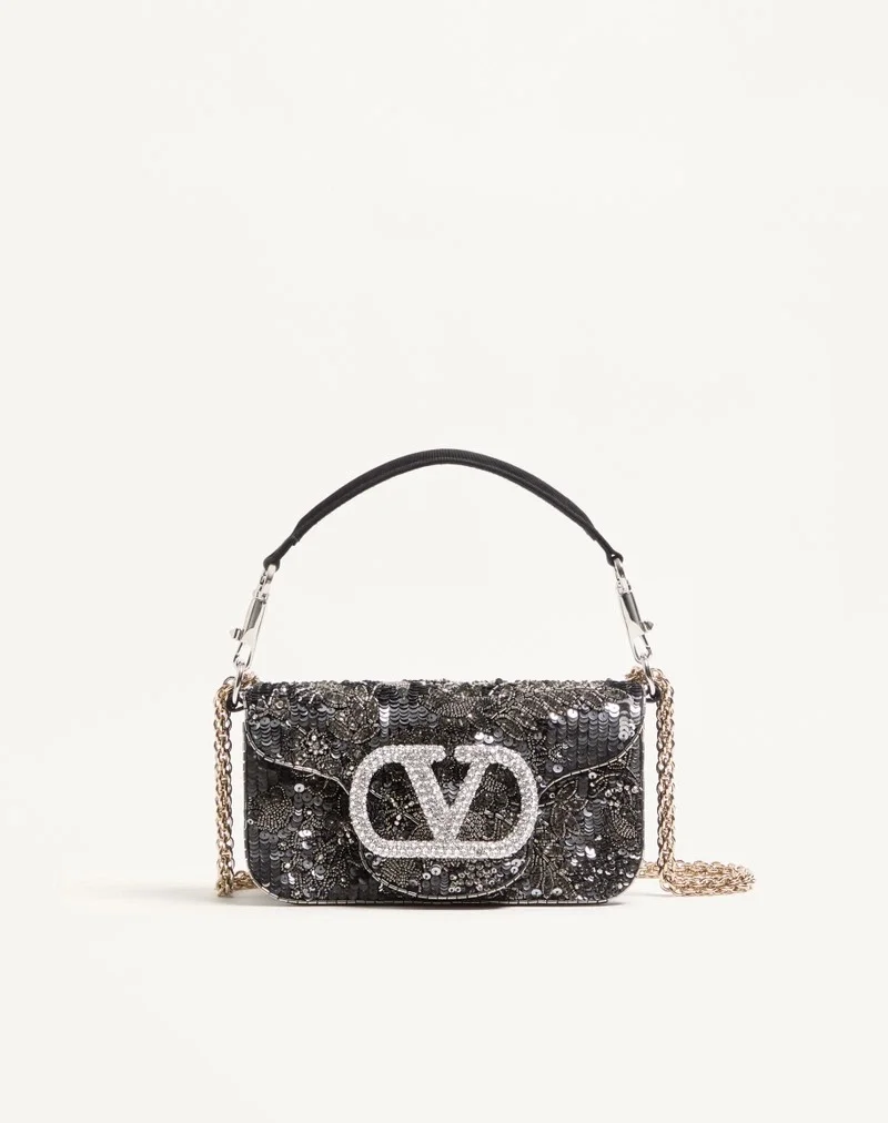 Valentino Garavani Locò small shoulder bag in satin with floral embroidery and VLogo Signature jewel feature. Equipped with both a detachable sliding chain and a detachable handle, this accessory can be worn as a crossbody/shoulder bag or carried as a handbag.