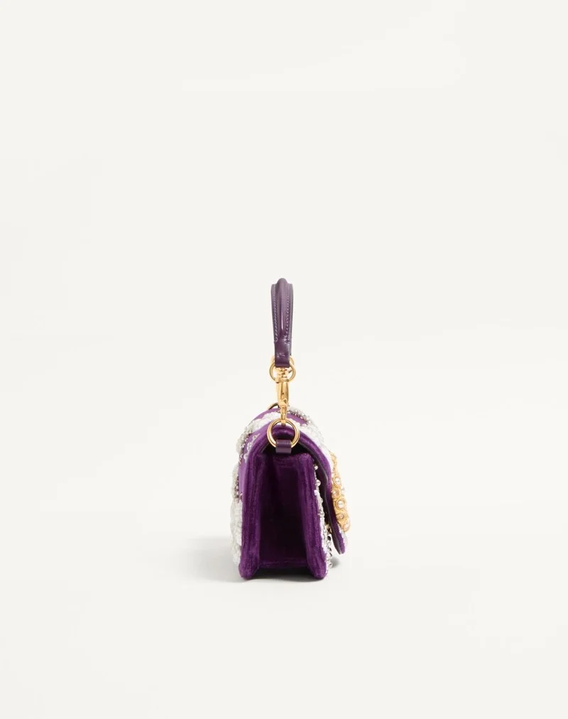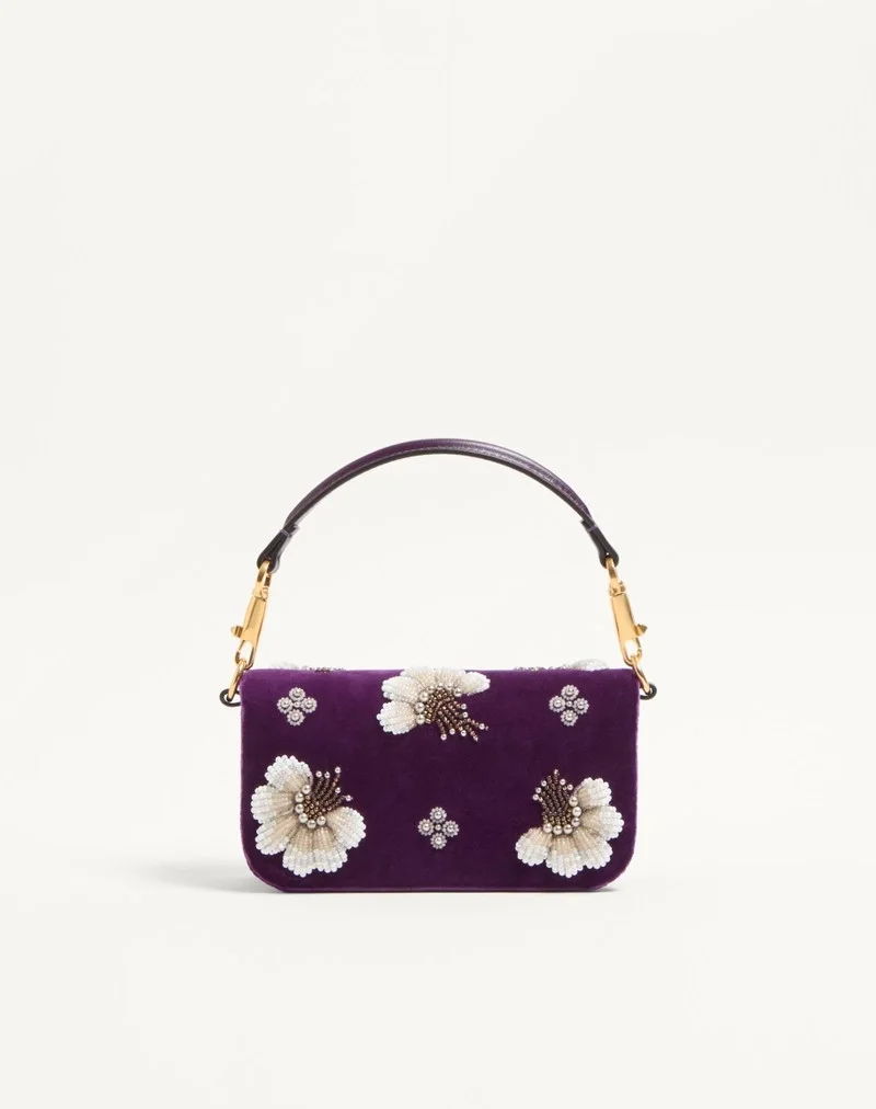 Valentino Garavani Locò small shoulder bag in velvet with floral embroidery and VLogo Signature jewel feature. Equipped with both a detachable sliding chain and a detachable handle, this accessory can be worn as a crossbody/shoulder bag or carried as a handbag.