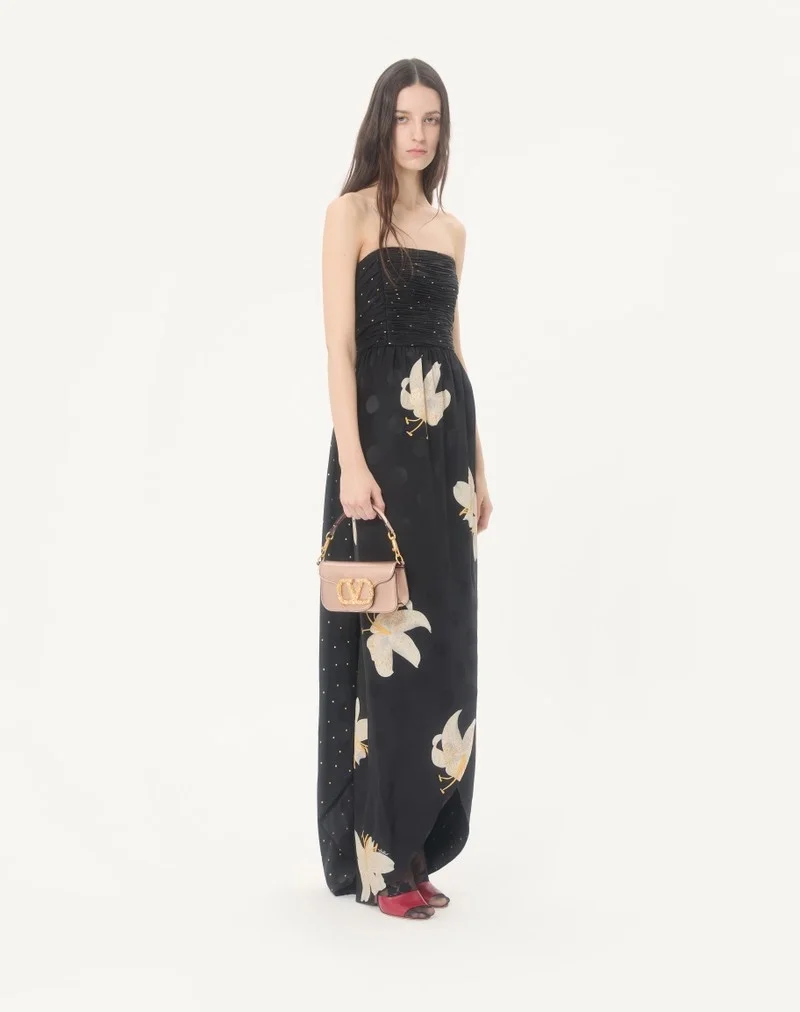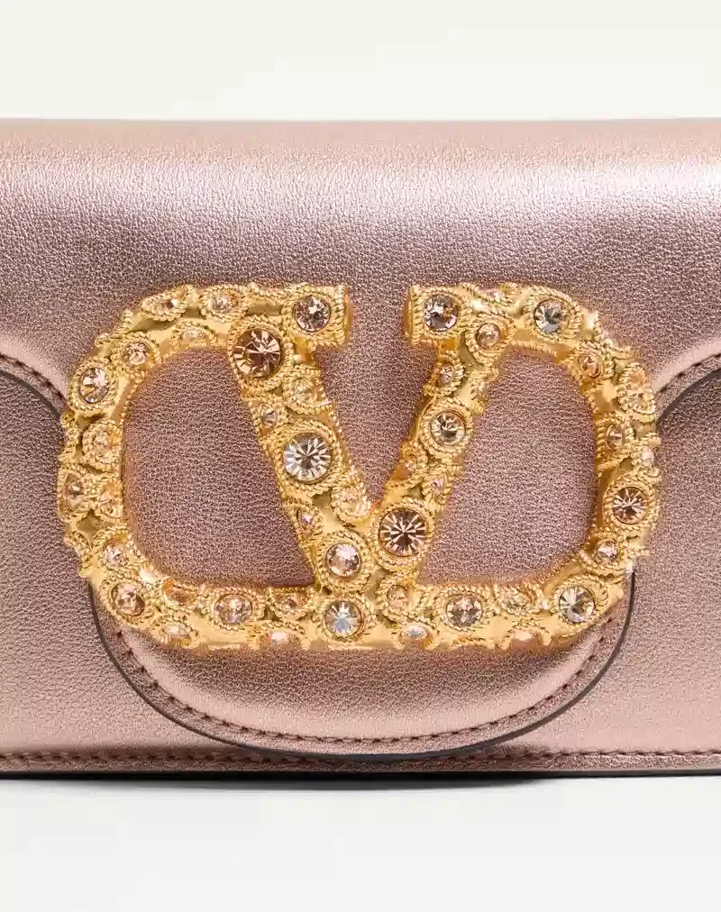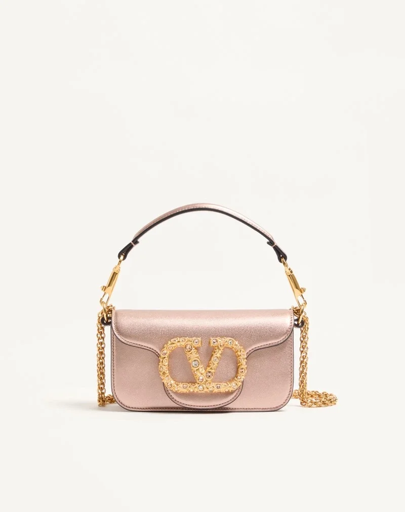 Valentino Garavani Locò small shoulder bag in laminated calfskin leather with VLogo Signature jewel element. Equipped with both a detachable sliding chain and a detachable handle, this accessory can be worn as a crossbody/shoulder bag or carried as a handbag.