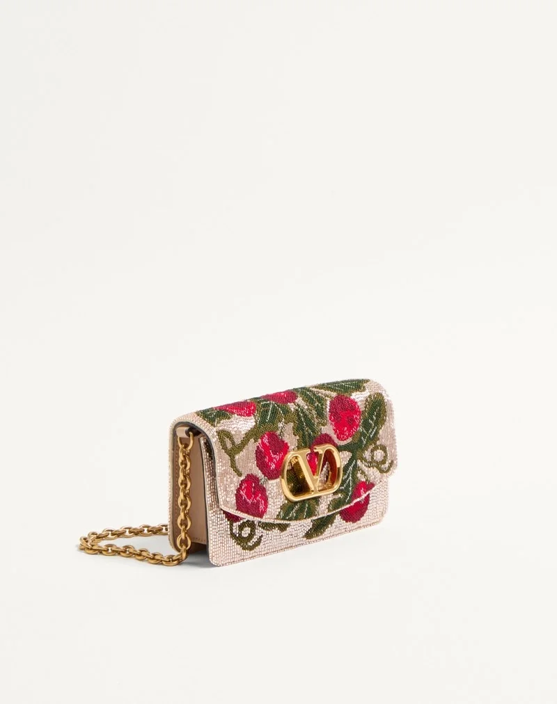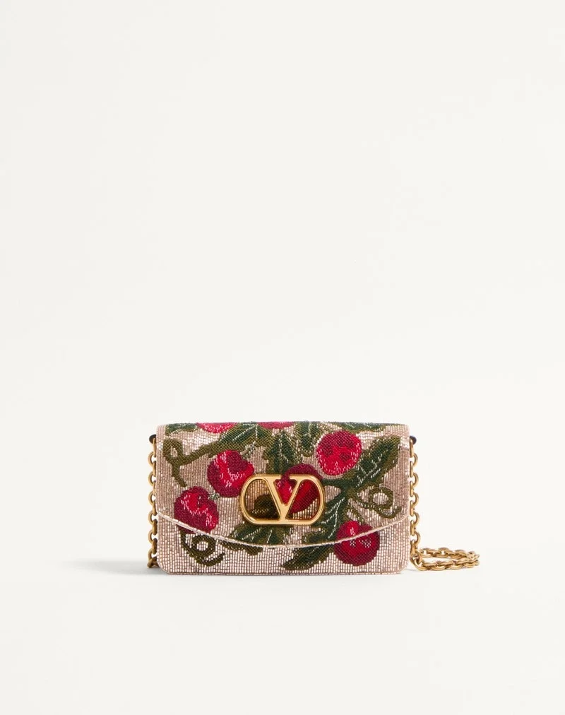 Valentino Garavani Vain clutch embroidered with Cherryfic cross stitch pattern on a beaded base and metallic VLogo Signature feature. The bag can be carried on the shoulder/cross-body thanks to the leather shoulder strap and chain, both of which are detachable.