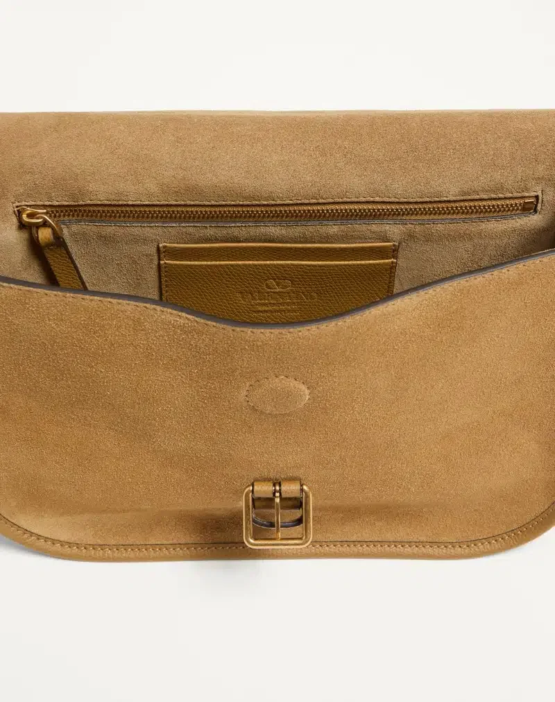 Valentino Garavani Antibes shoulder bag in suede with leather patch detail and VLogo Signature metal feature. The bag can be carried on the shoulder/cross-body thanks to the adjustable leather shoulder strap.