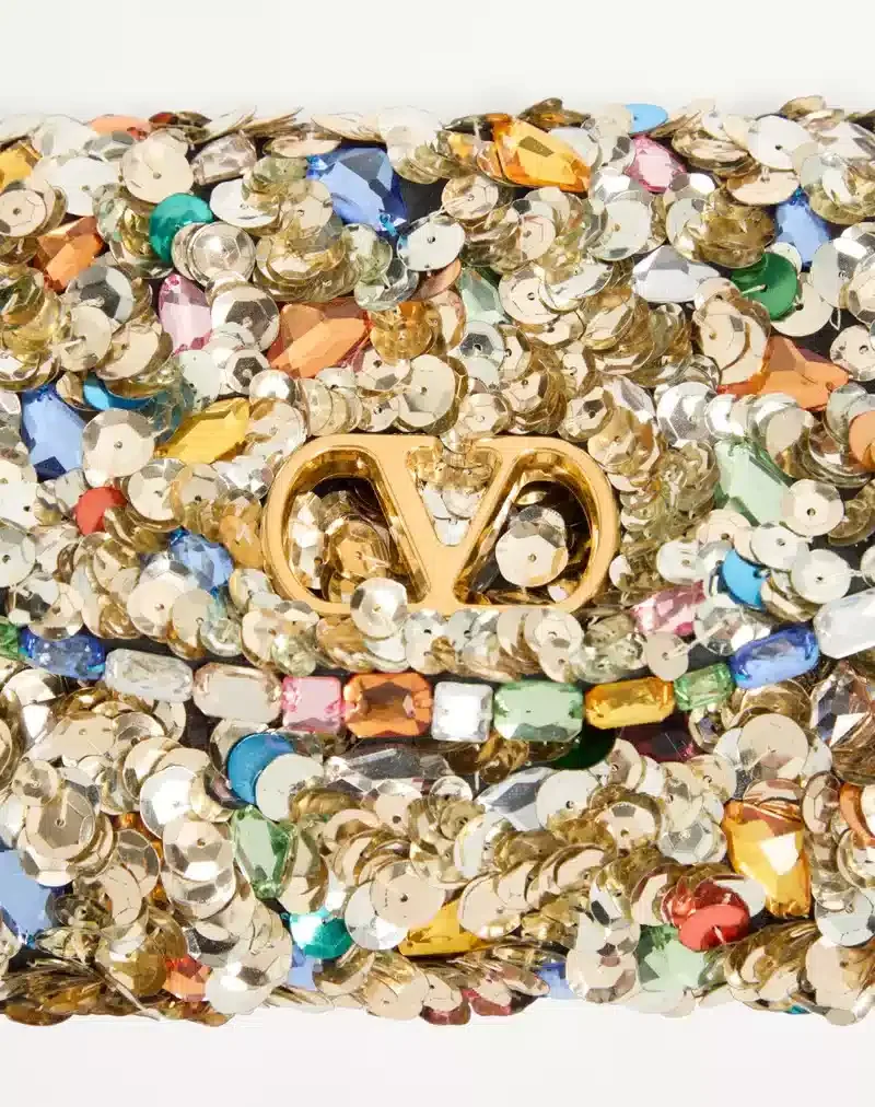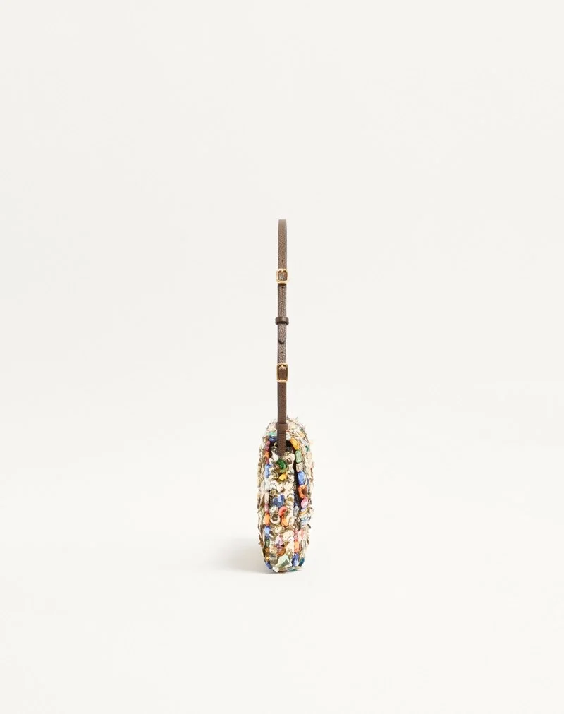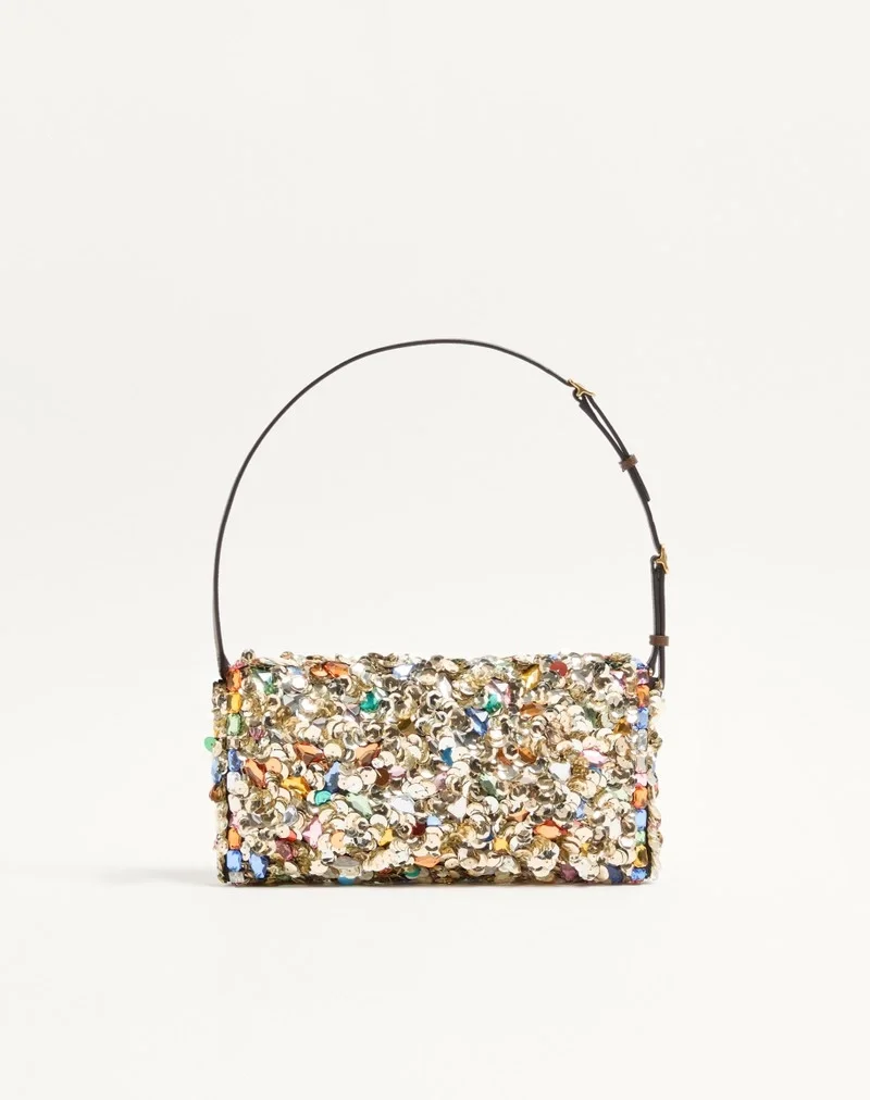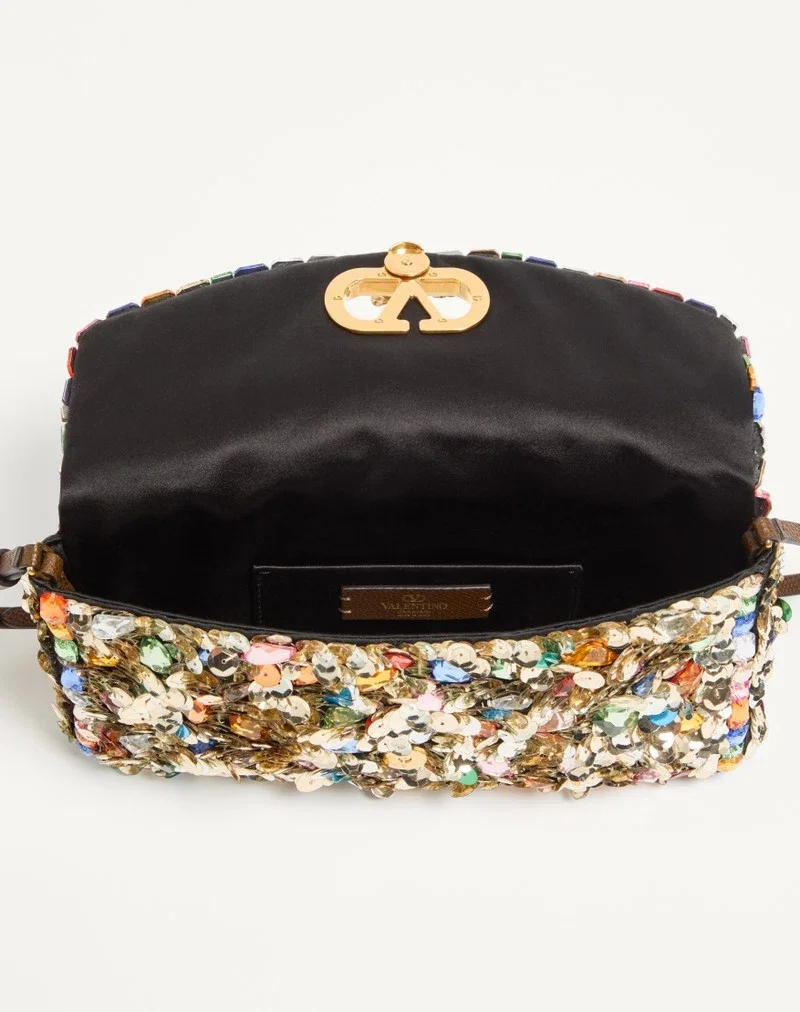 Valentino Garavani DeVain small shoulder bag with sequin and stone embroidery. VLogo Signature metal feature.