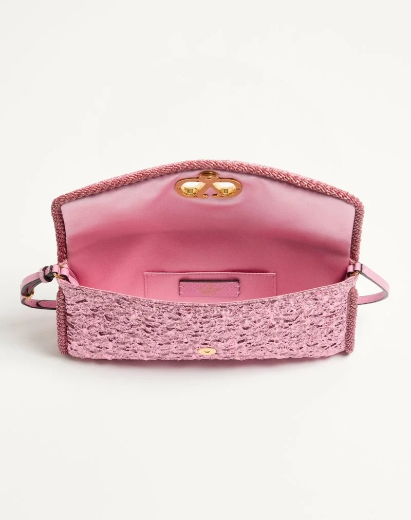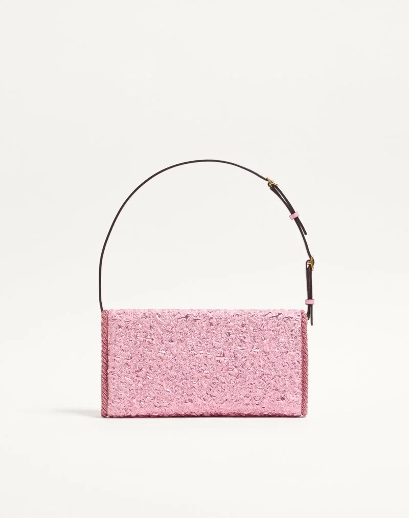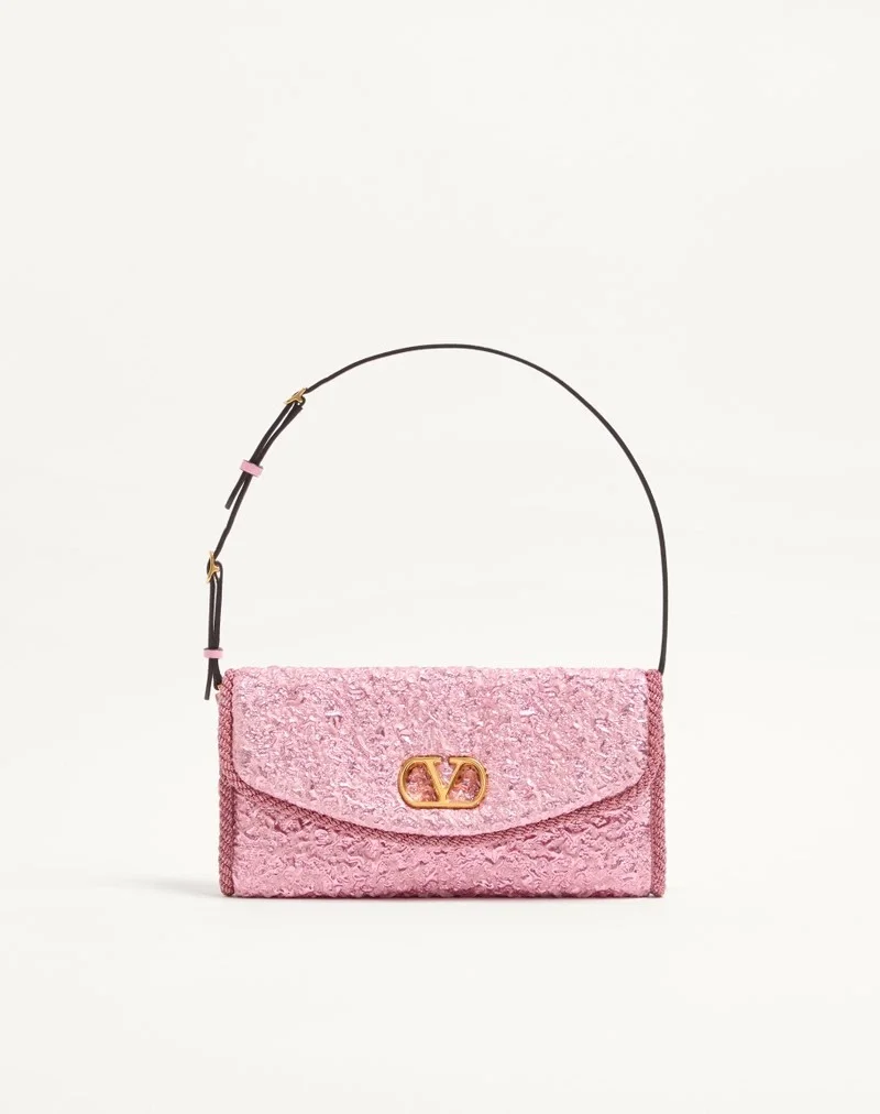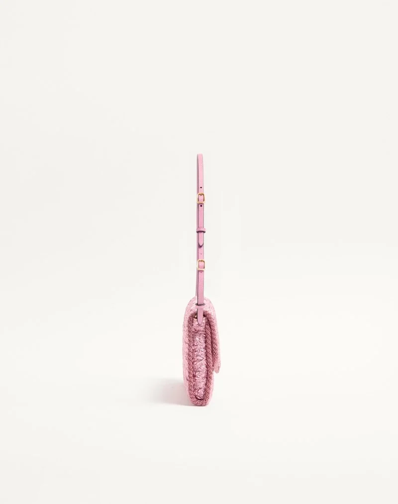 Valentino Garavani DeVain small shoulder bag in cloqué jacquard fabric and metallic VLogo Signature detail. The bag can be carried by hand or worn over the shoulder.