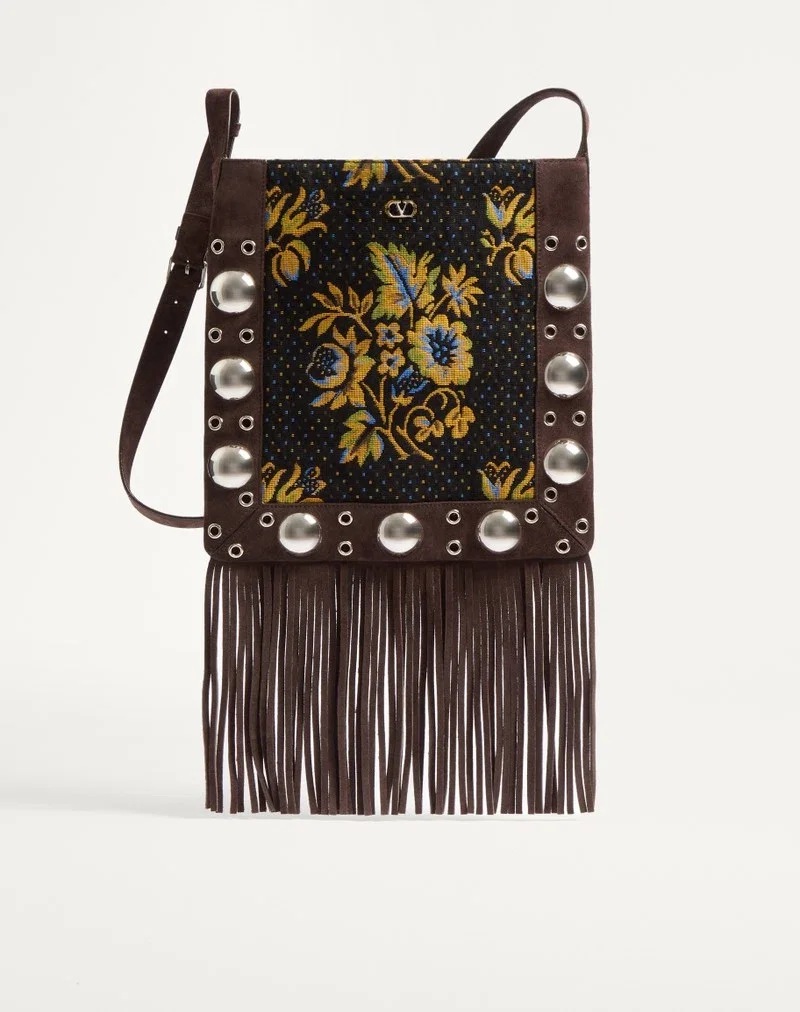 Valentino Garavani Nellcôte shoulder bag in jacquard fabric with floral pattern and fringes. Suede trim decorated with ball studs and rivets. The bag can be comfortably worn on the shoulder/crossbody thanks to the adjustable suede shoulder strap.