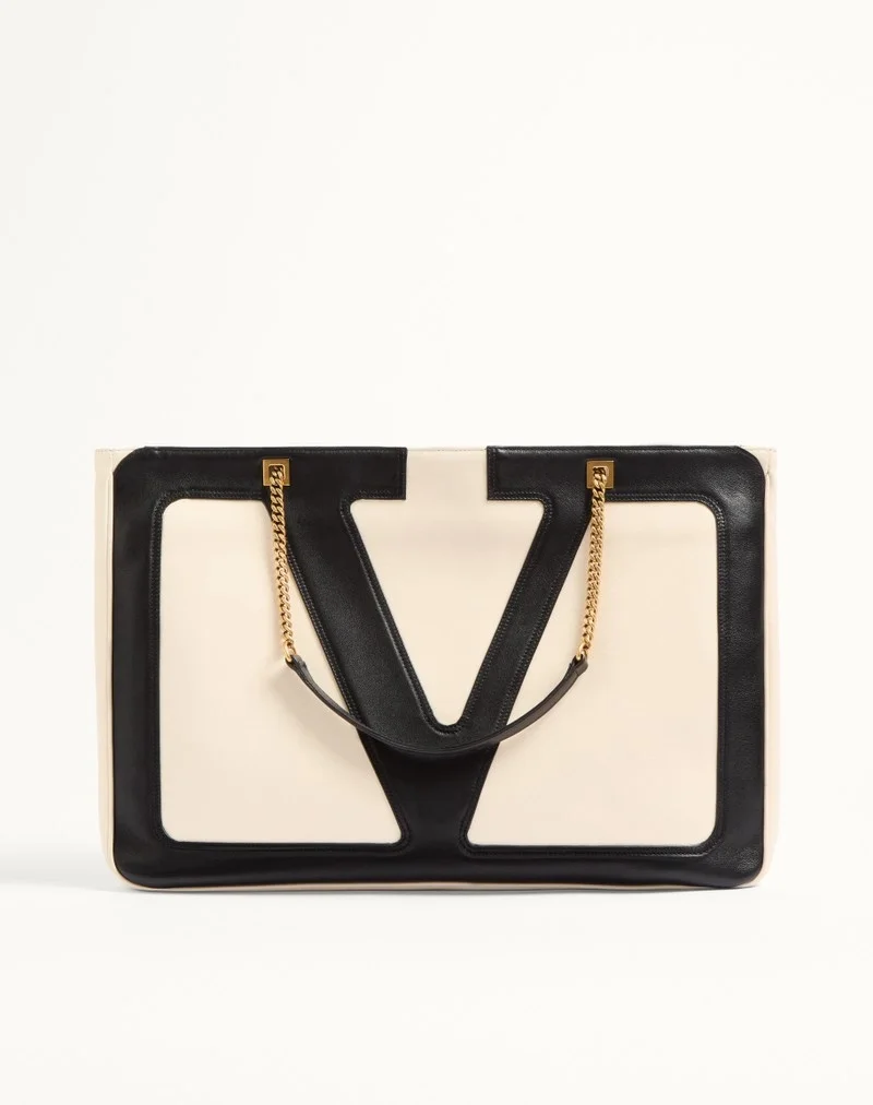 Valentino Garavani Viva Superstar large nappa leather shopping bag. The bag features a contrasting maxi VLogo Signature and can be worn over the shoulder thanks to the sliding chain.