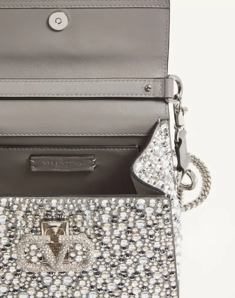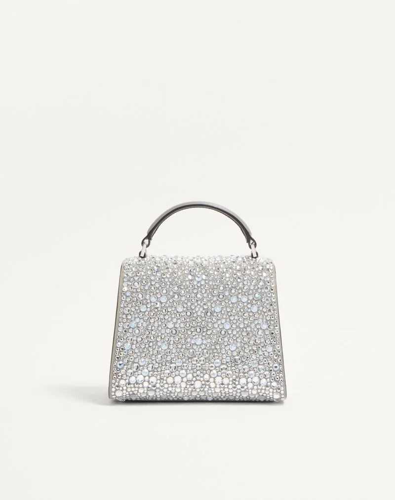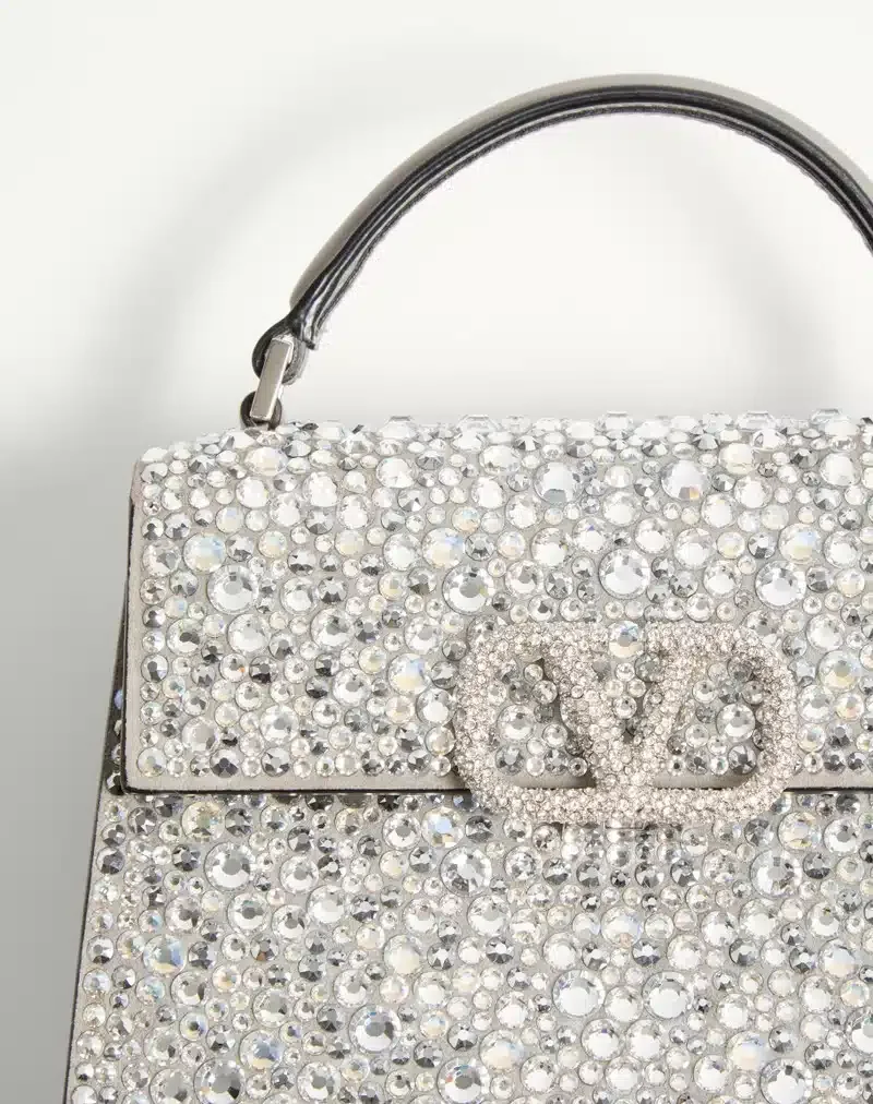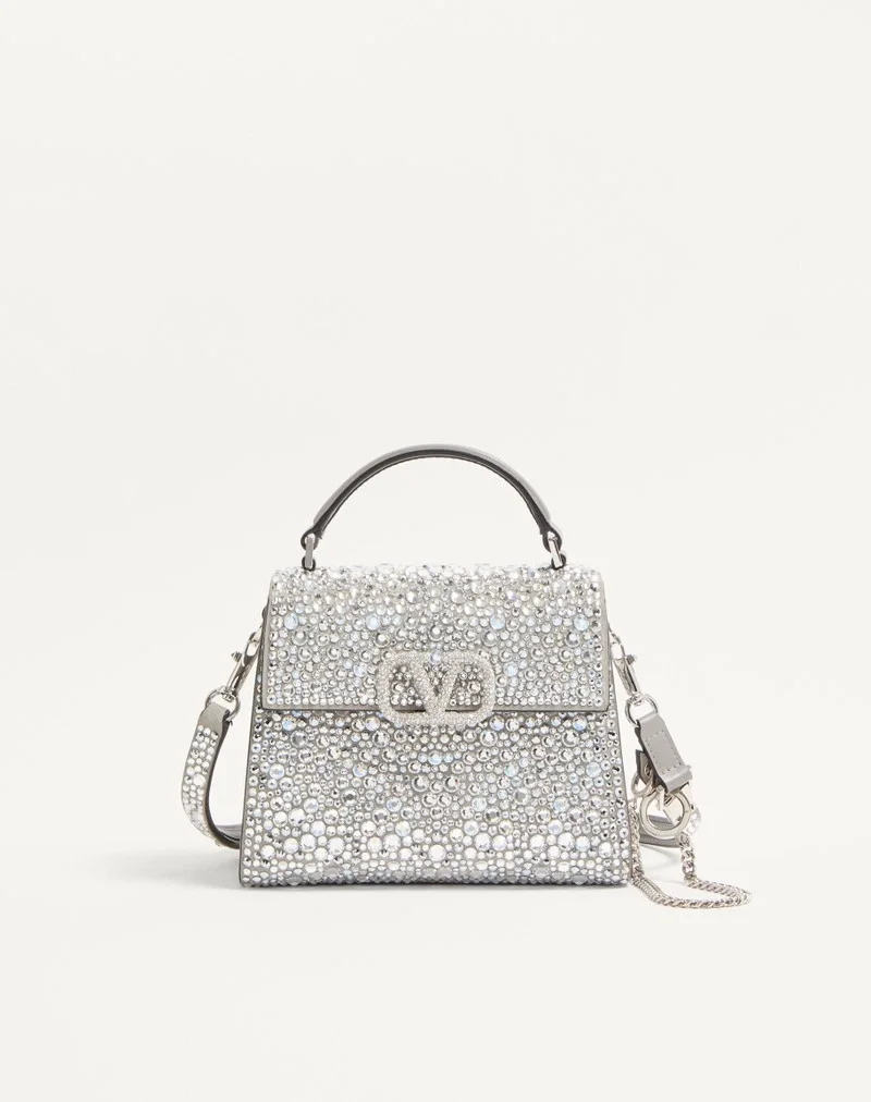 Mini Valentino Garavani VSLING handbag entirely covered in rhinestones with VLogo Signature closure.