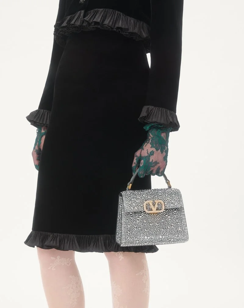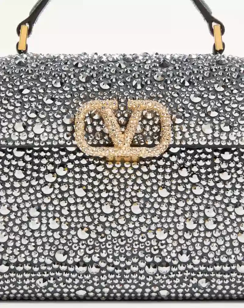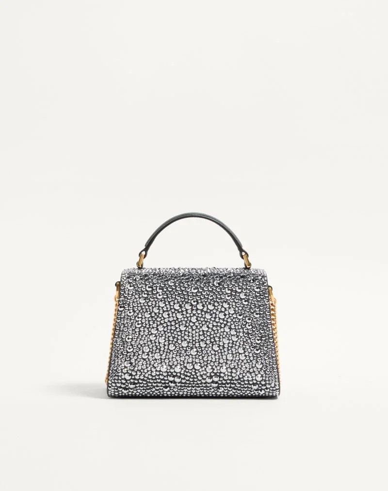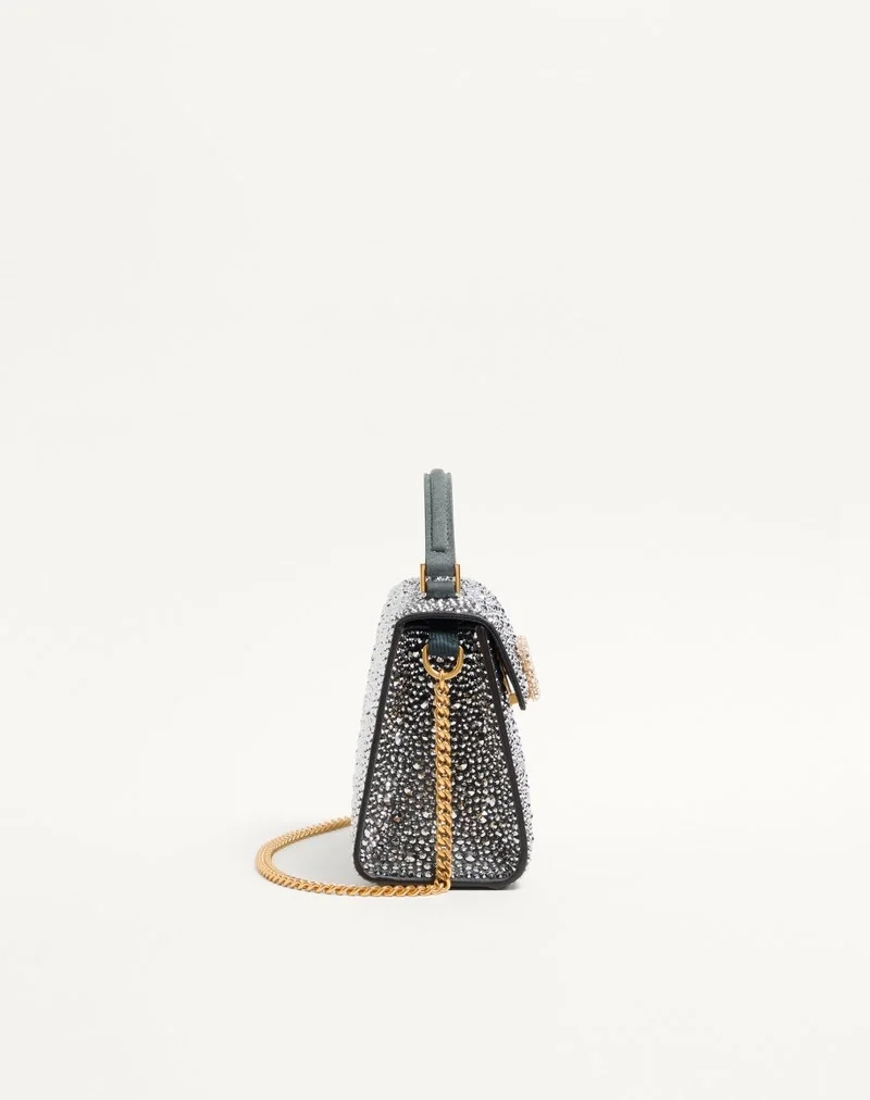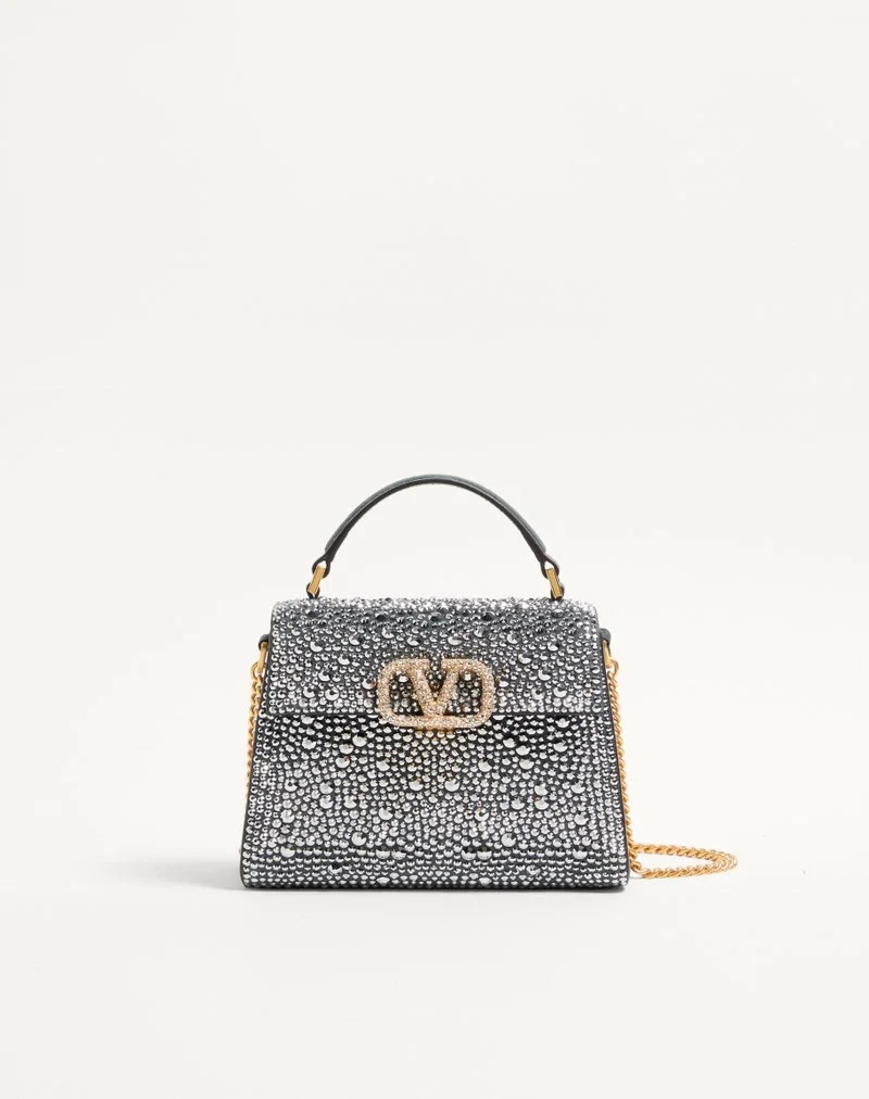Valentino Garavani VSLING mini handbag entirely covered in rhinestones with VLogo Signature jewel closure. The bag can be carried on the shoulder or cross-body thanks to the removable chain, and by hand using the suede handle.