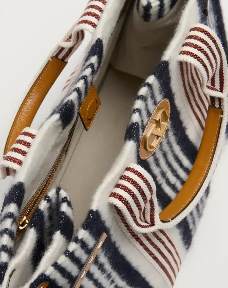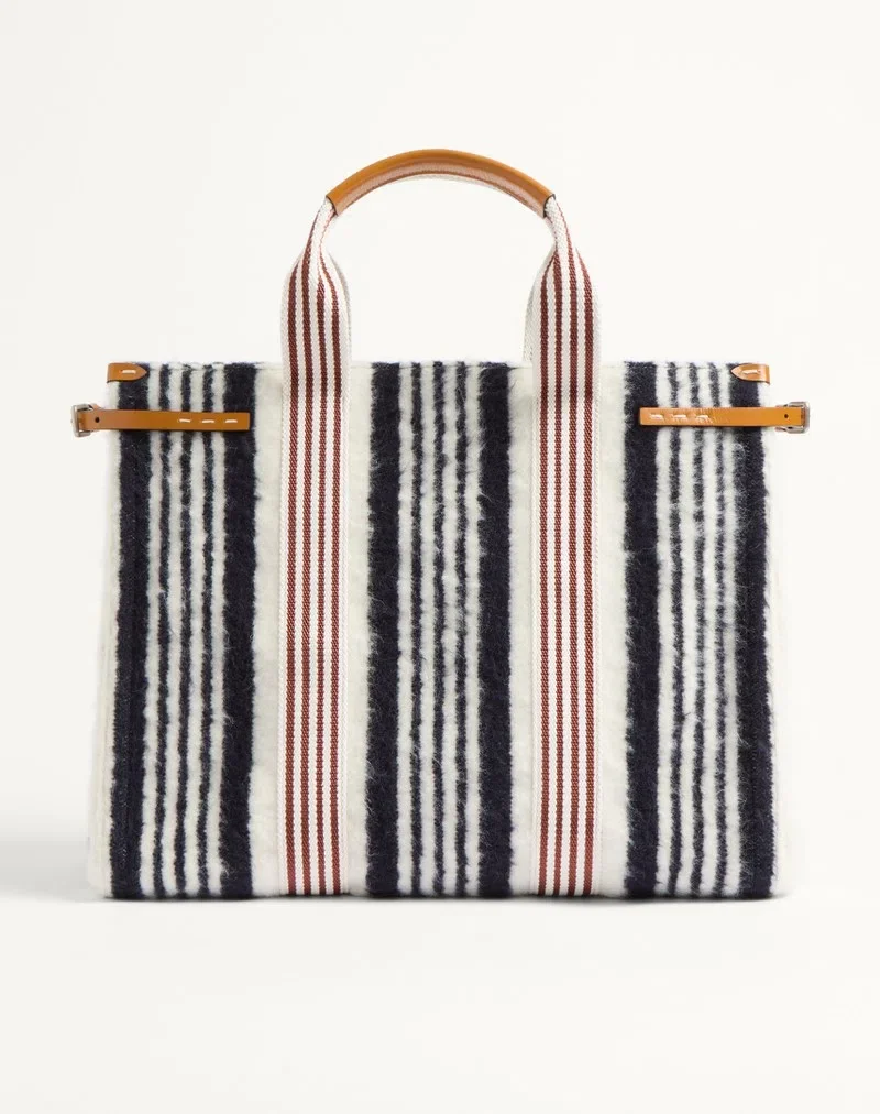 Valentino Garavani Antibes shopping bag in wool with striped pattern featuring side buckles and leather patches with VLogo Signature metal element.