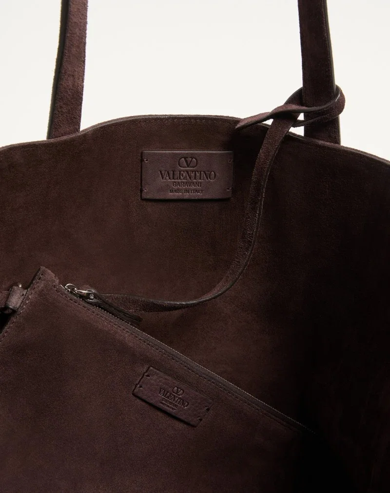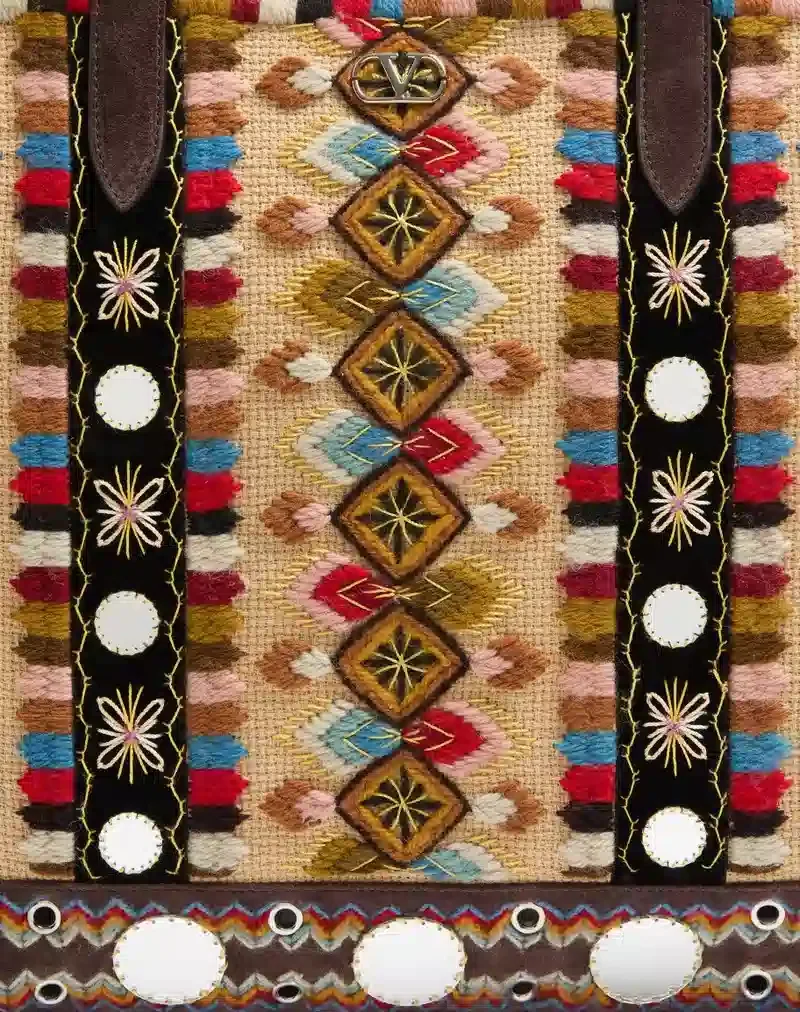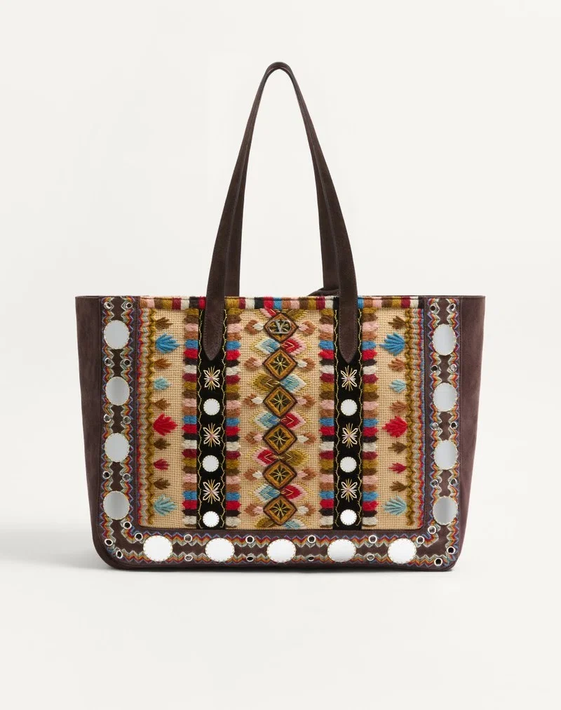 Valentino Garavani Nellcôte large shopping bag with geometric embroidery. Suede trim decorated with embroidery, mirrors, and rivets. The bag can be comfortably worn on the shoulder or by hand thanks to the handles.