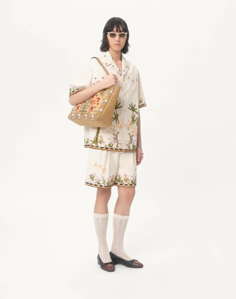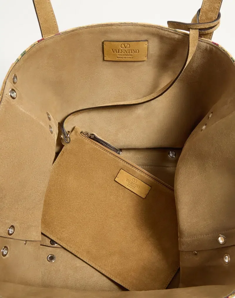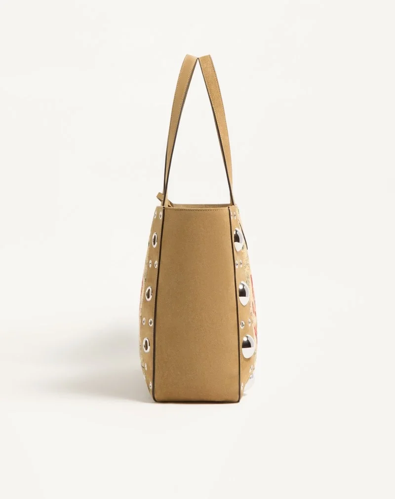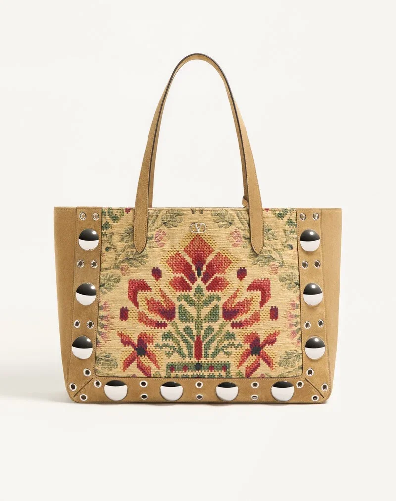 Valentino Garavani Nellcôte shopping bag in jacquard fabric with floral pattern. Suede trim decorated with ball studs and rivets. The bag can be comfortably worn on the shoulder or by hand thanks to the handles.