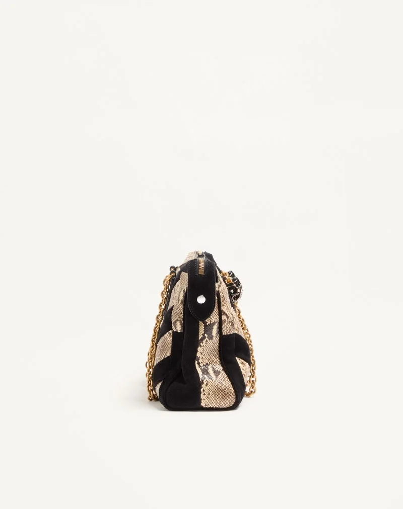 Valentino Garavani Panthea shoulder bag in python and suede patchwork with chevron motif. Bag features enameled feline heads adorned with Swarovski® crystals. The bag can be worn over the shoulder by the shoulder strap or carried by hand with the handles.