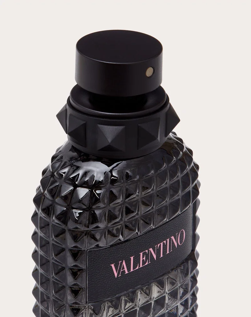 The bottle pays a tribute to the iconic Valentino Rockstud. This small pyramidal shape; inspired by the magnificent Roman architecture; is the signature of Maison Valentino fashion. The elegant and classic black multifaceted bottle is made modern thanks to the daring pink Valentino signature. At Valentino; pink is punk.