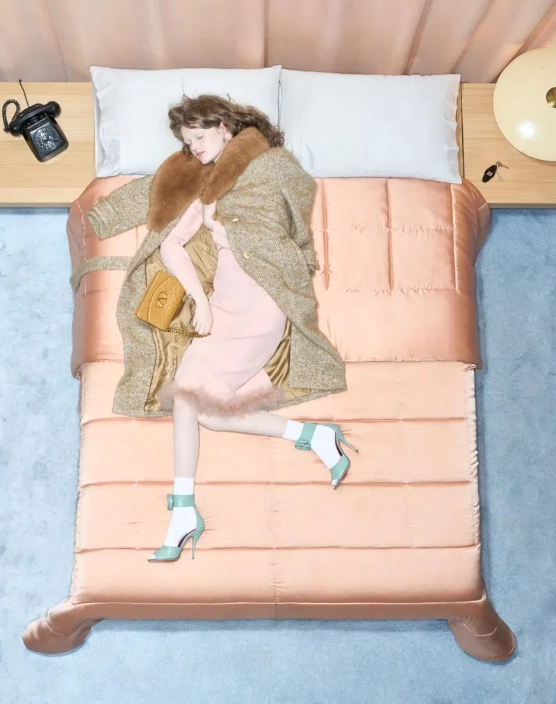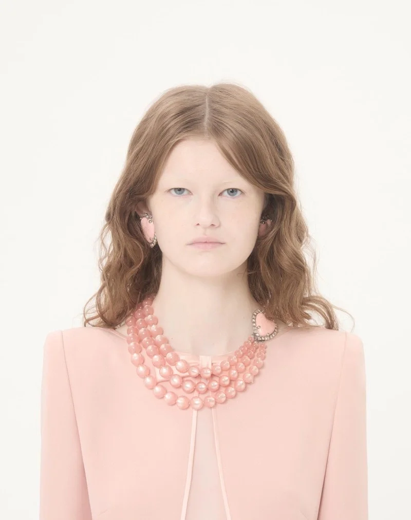 The look of the model is completed by a Valentino Garavani Panthea Bag and Valentino Garavani Drip Rose Shoes.