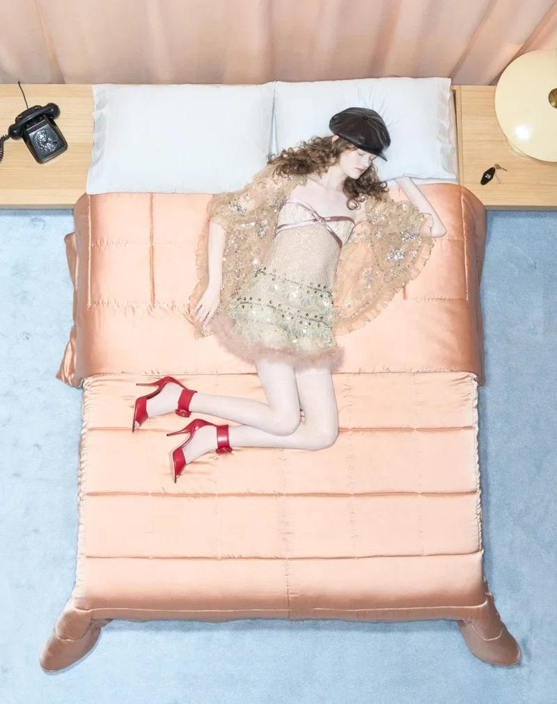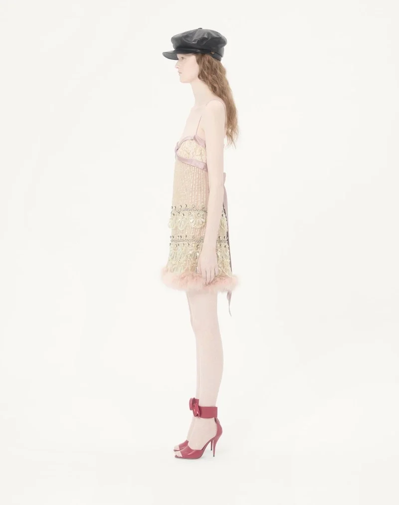 The look of the model is completed by a Valentino Garavani Panthea Bag and Valentino Garavani Drip Rose Shoes.