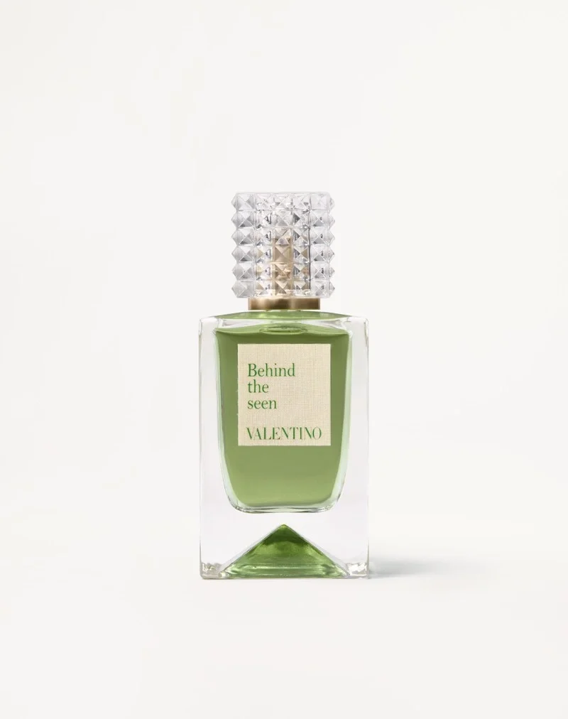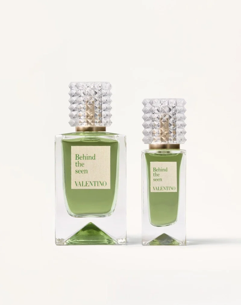 The rectangular glass bottle stands the true test of time. A transparency evincing that there is nothing to hide yet everything to discover. The studded cap made of glass echoes Maison Valentino’s signature emblem, the stud, a square and cruciform shape that pays homage to Rome and to the “bugnato” found on the Roman Palazzos. A recognizable insignia that has expressed the Maison’s identity over time.