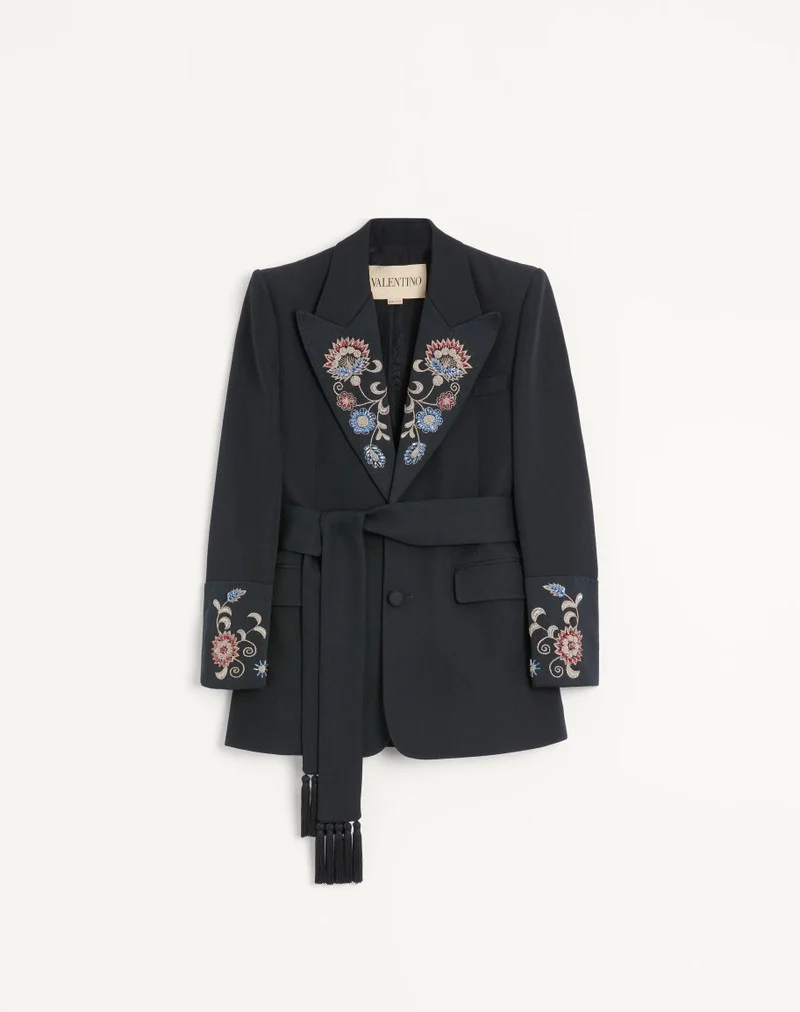 Valentino Embroidered Belted Jacket in Grain De Poudre Wool