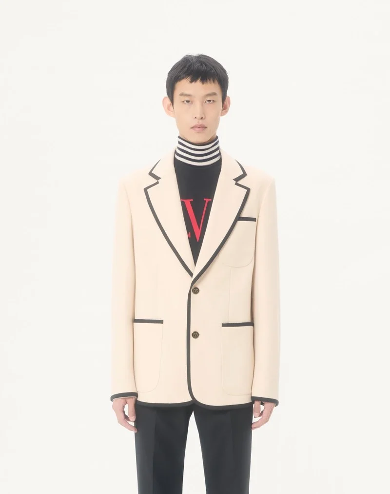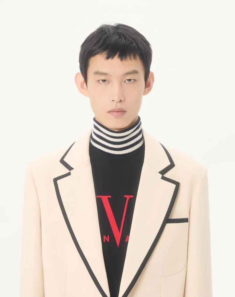 The look of the model is completed by a Valentino Garavani Hoboho Bag and Valentino Garavani Mockers Shoes.