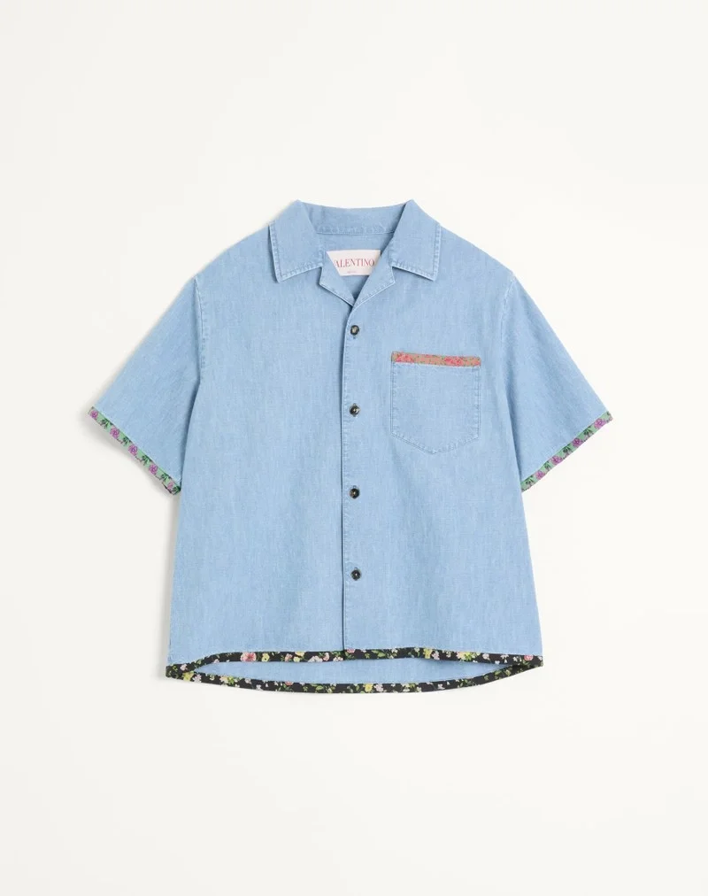 Visit the Valentino Online Boutique and discover Denim Bowling Shirt With Floral Print Trim for Man. Complimentary shipping and returns.