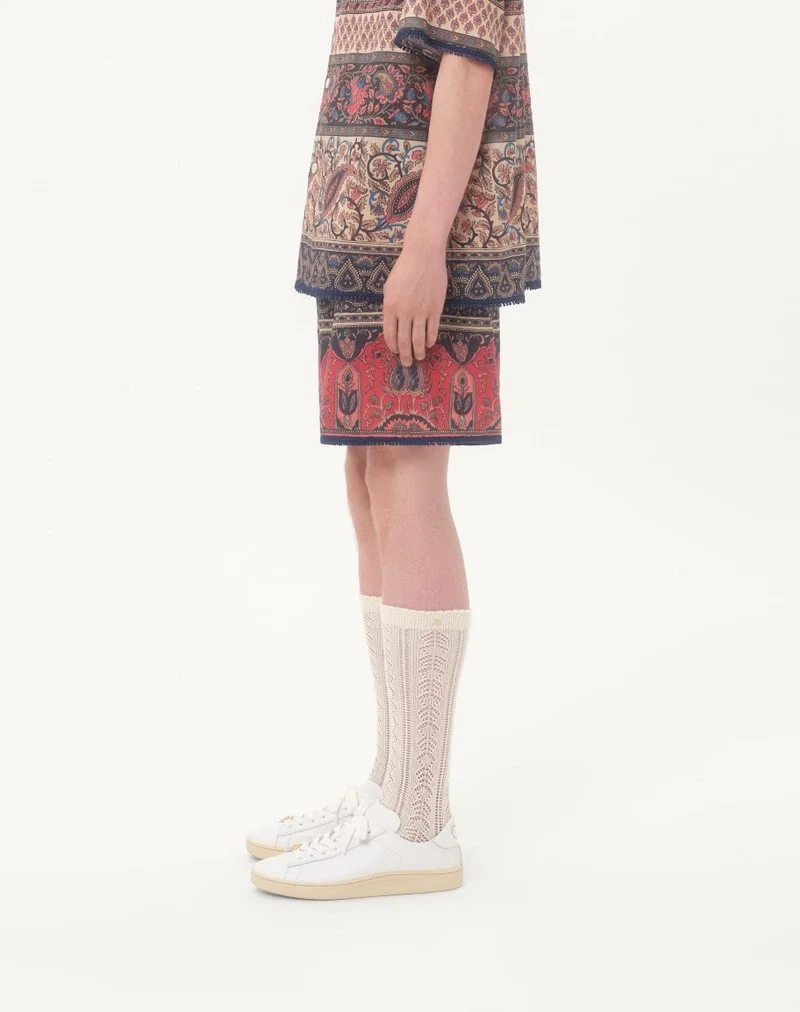 Valentino cotton muslin bermuda shorts with all-over Voyage Imaginaire print and passementerie trim