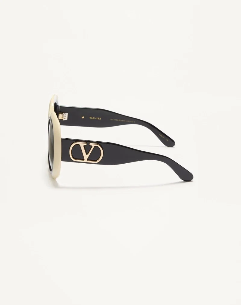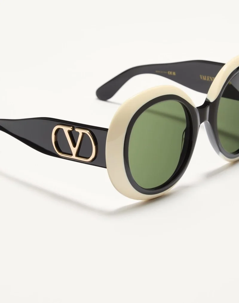 Inspired by the 1960s, it blends classic vintage charm with contemporary design. Round, oversized design. Optical illusion and chromatic play: a layered acetate construction creates a captivating ‘shape-within-a-shape’ effect, adding fluidity and depth. Oversized VLogo mechanically screwed onto the temple for maximum visibility and impact.