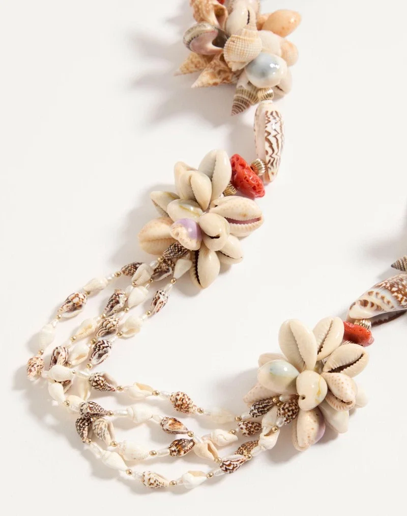 Jardin Aquatique necklace in metal, enamel, fabric, shells, coral, and natural pearls