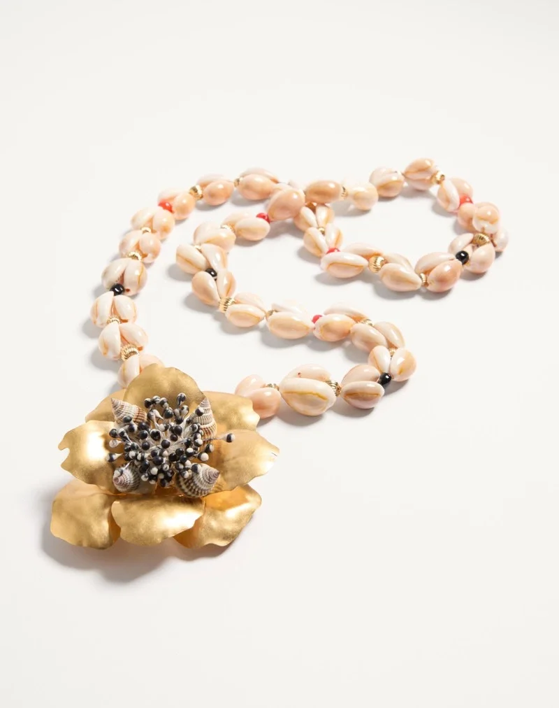 Jardin Aquatique necklace in metal, fabric, shells, coral, and onyx