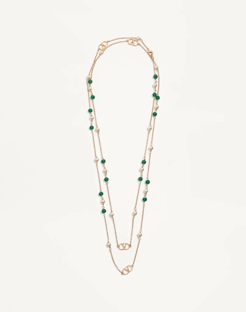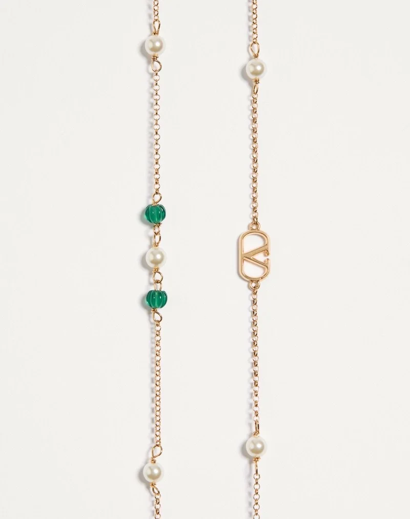 Visit the Valentino Online Boutique and discover Vlogo Signature Long Necklace In Metal, Pearls And Knurled Glass for Woman. Complimentary shipping and returns.