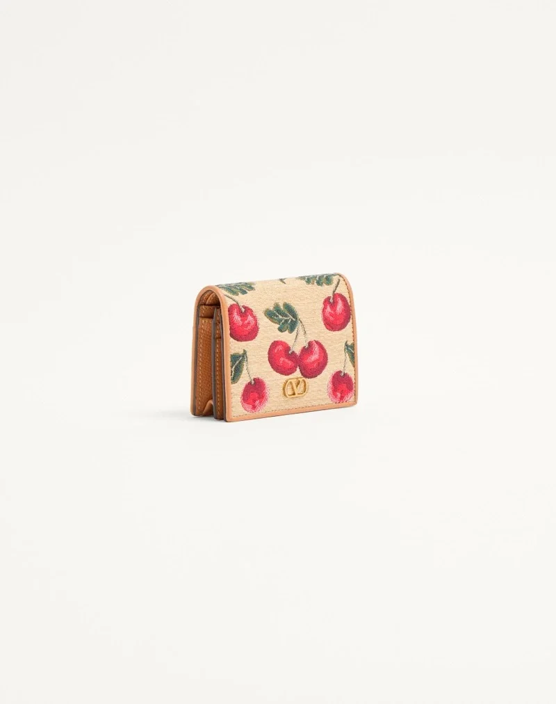 Valentino Garavani Vlogo Signature wallet in Jacquard Synthetic Raffia with cherryfic pattern.
