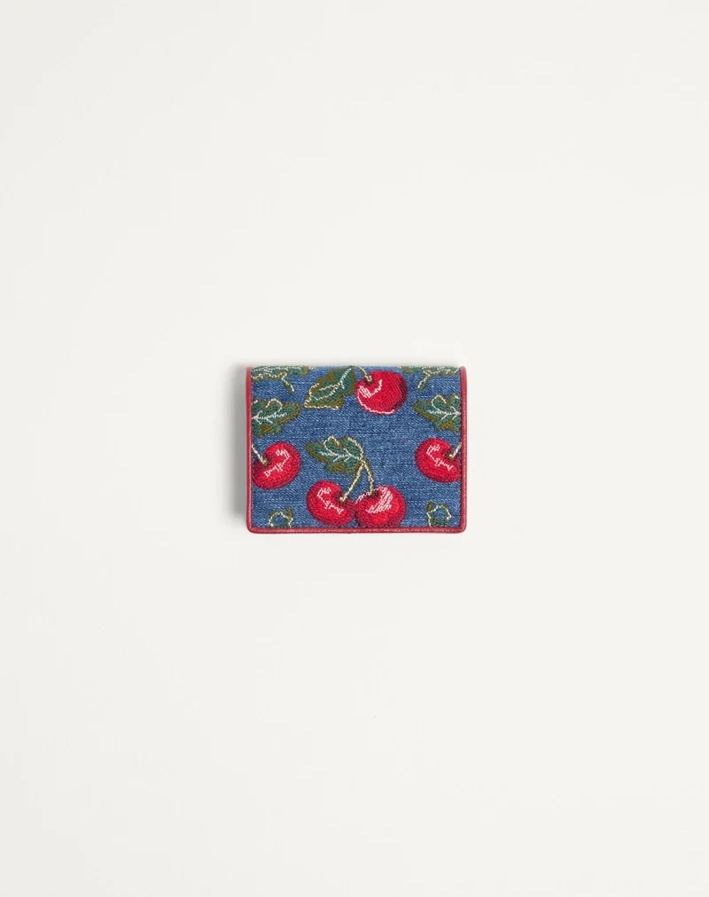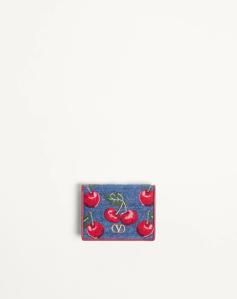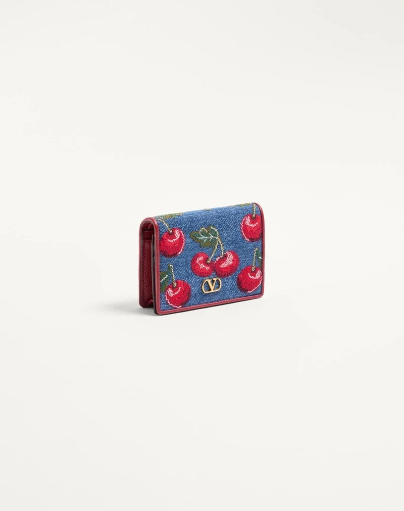 Valentino Garavani VLogo Signature wallet in denim with Cherryfic embroidery enhanced with leather trim.