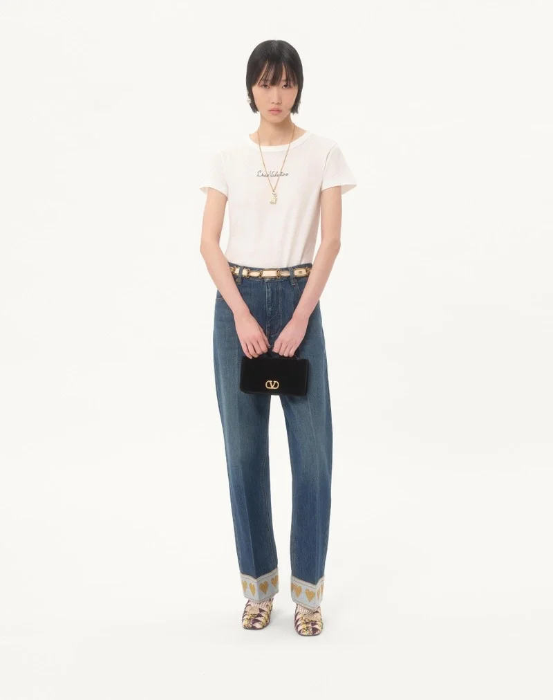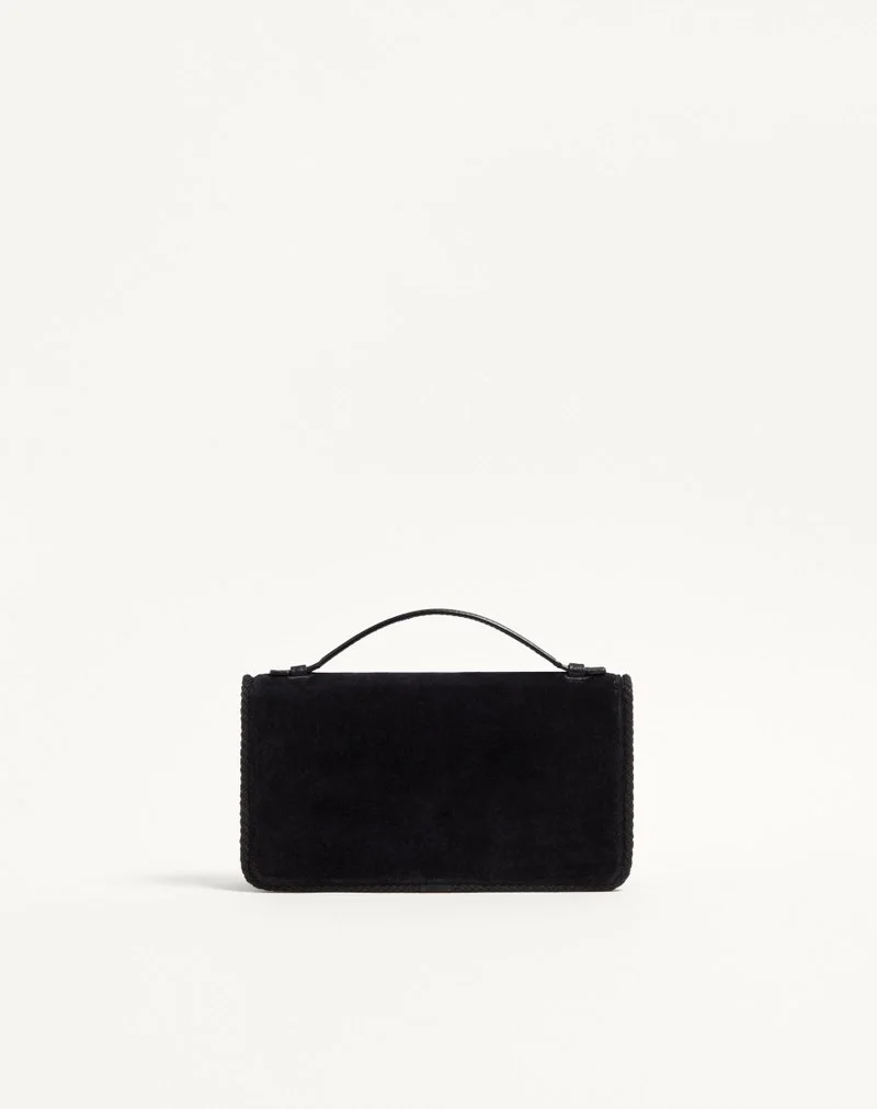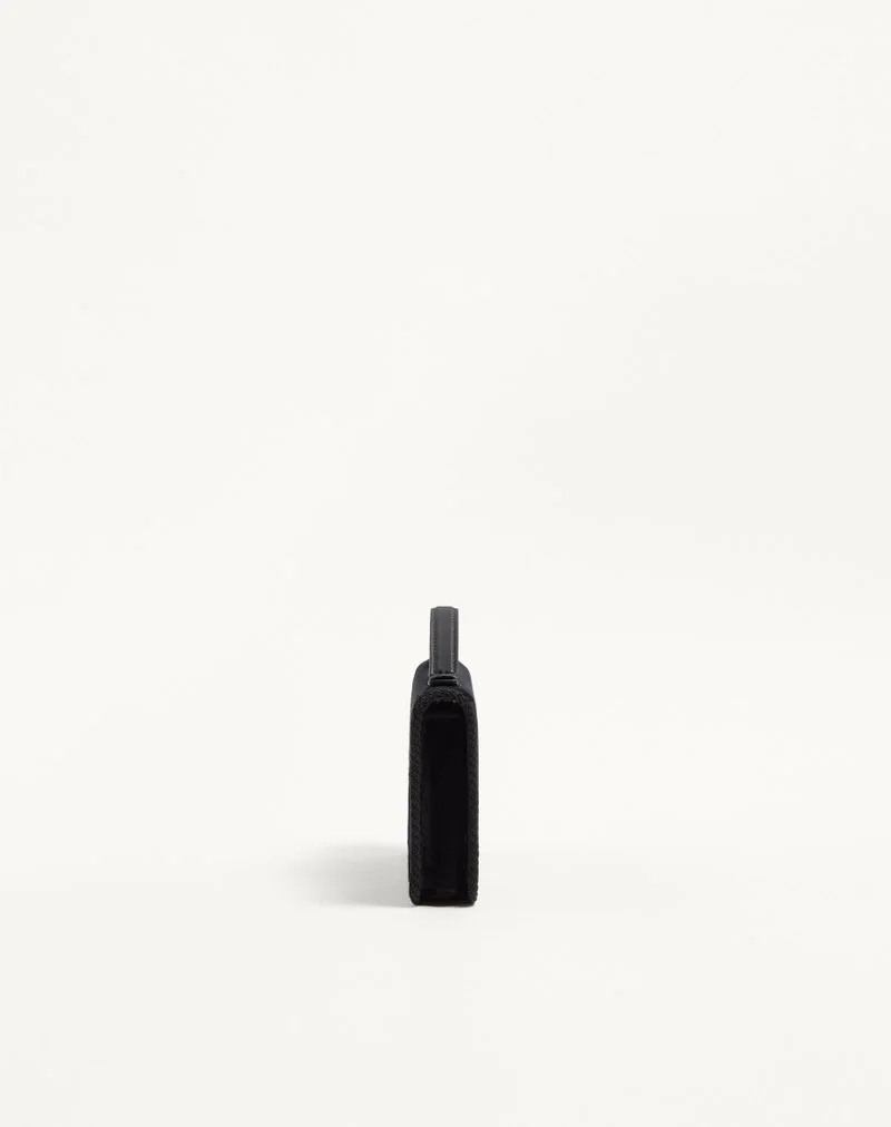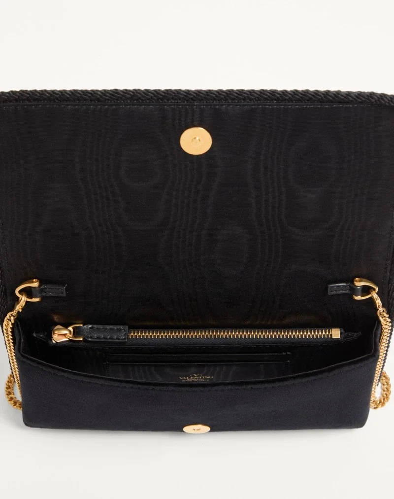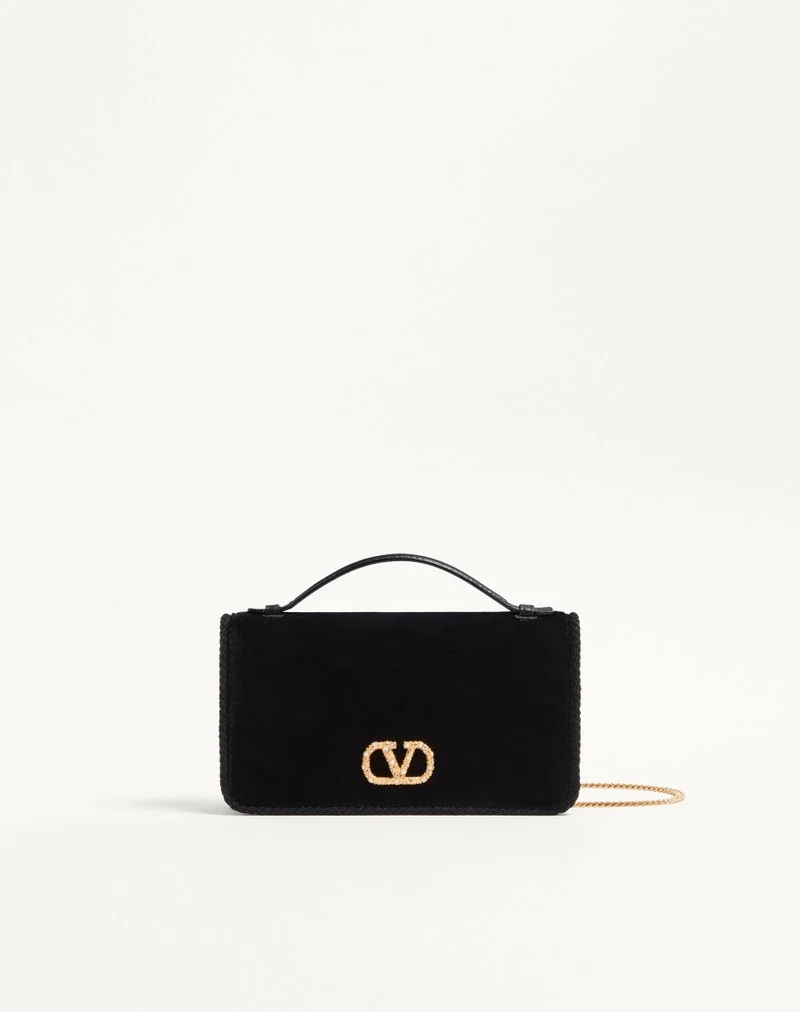 Valentino Garavani VLogo Signature velvet chain wallet with jewel logo. The accessory can be handheld or may be worn crossbody or over the shoulder thanks to the handle and the detachable chain.