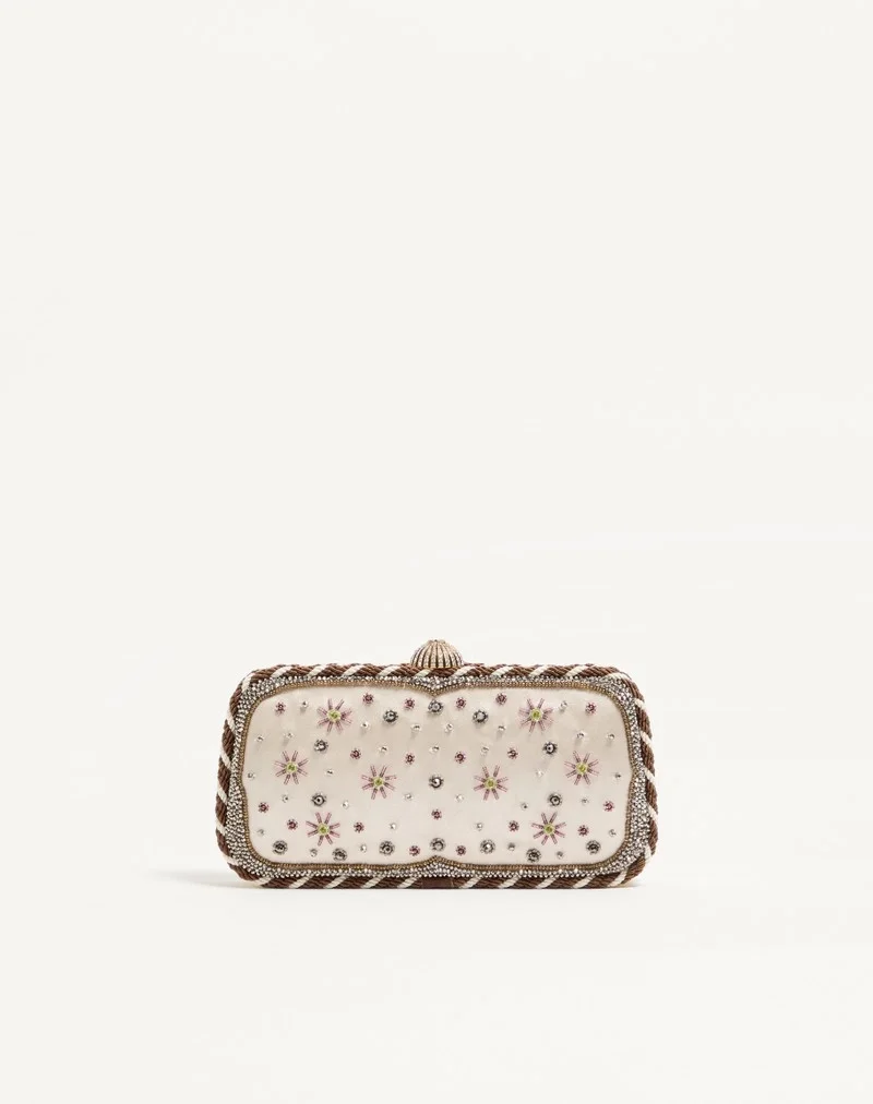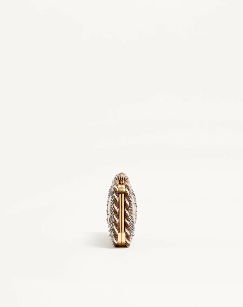 Valentino Garavani Carry Secrets satin minaudiere embroidered with beads and torchon trim. Closure with spherical element decorated with Swarovski® crystals and logo.