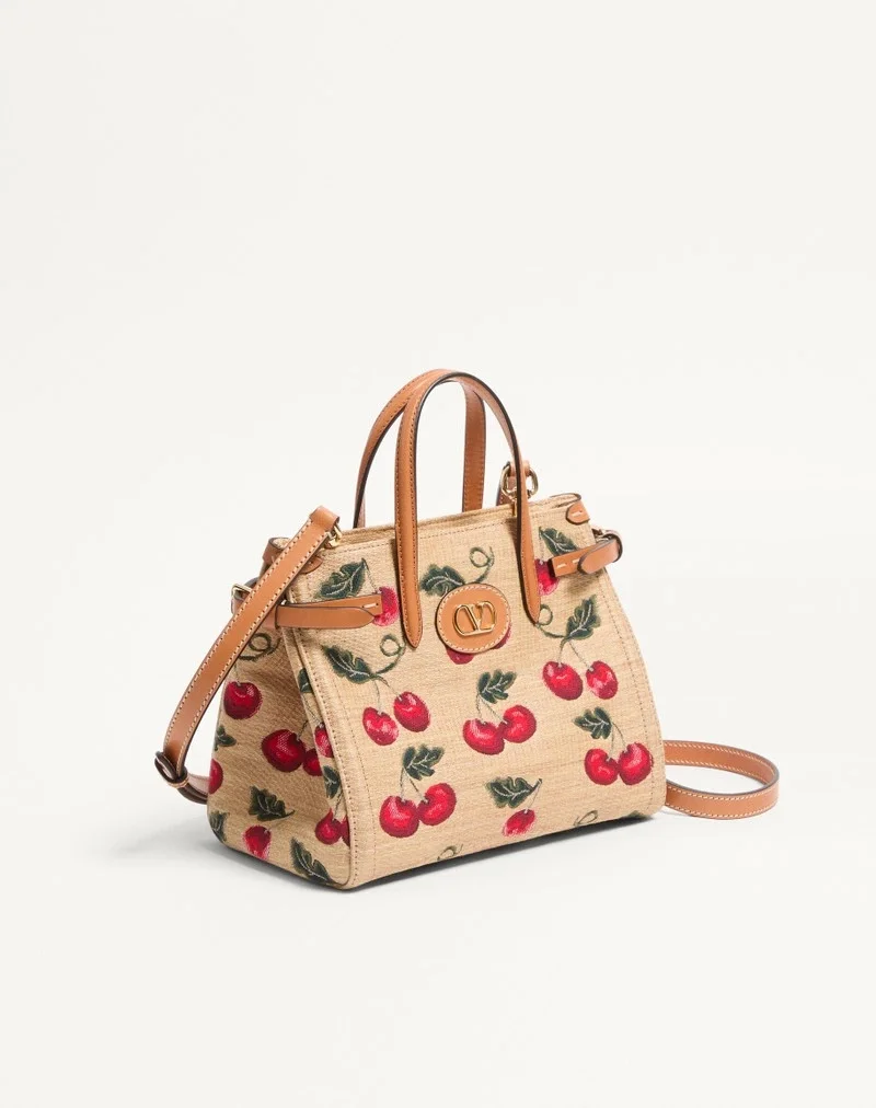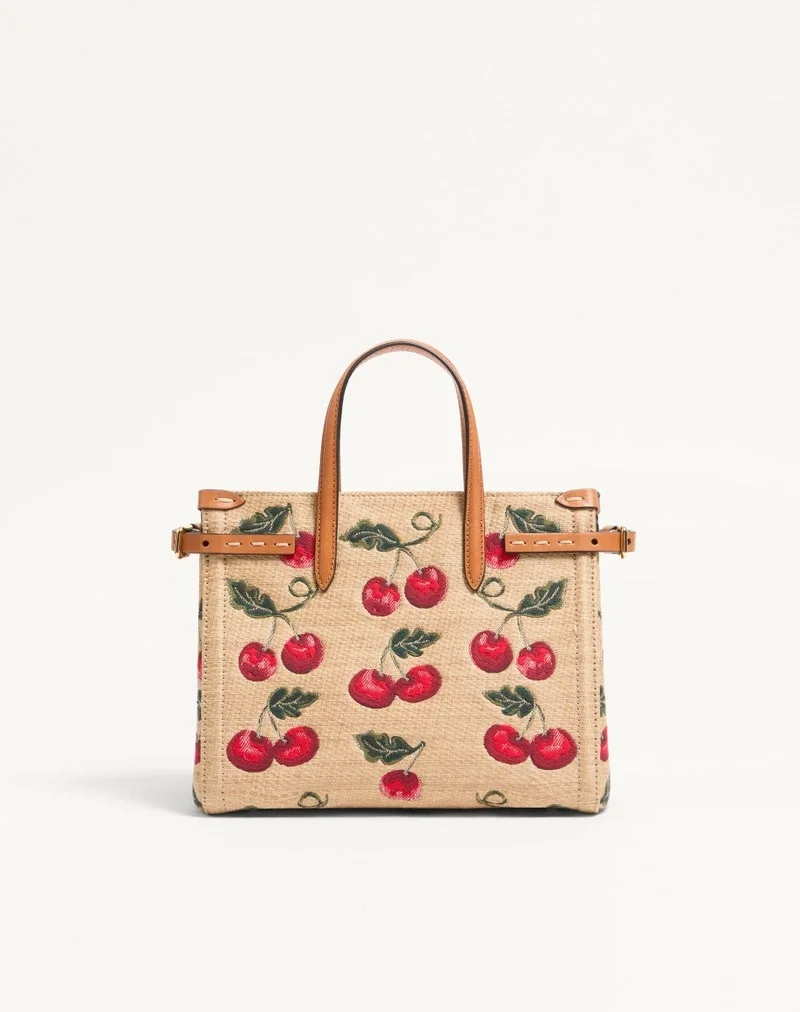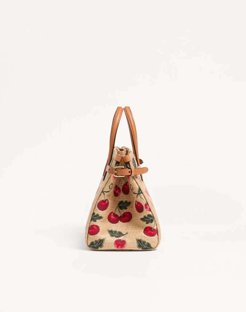 Valentino Garavani Antibes small shopping bag in synthetic jacquard raffia with a Cherryfic motif, detailed with side buckles and a leather patch with VLogo Signature metal feature. The bag can be handheld or comfortably worn on the shoulder/crossbody thanks to the handles and shoulder strap.