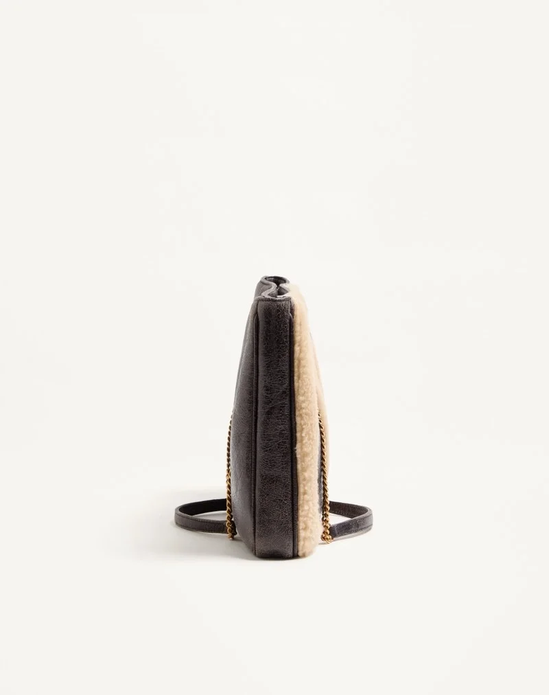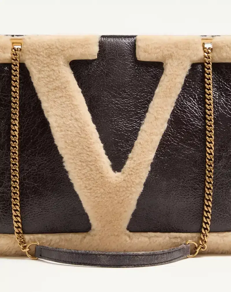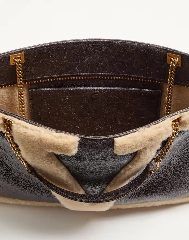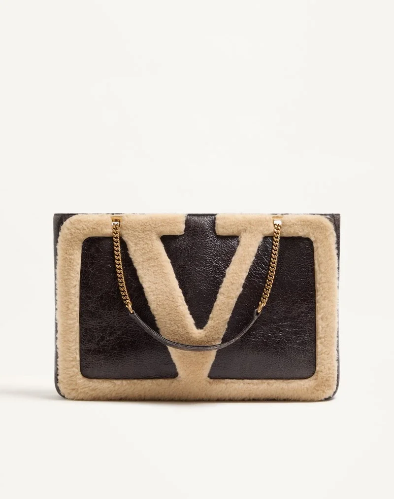 Valentino Garavani Viva Superstar medium shopping bag in shearling. The bag features a contrasting maxi VLogo Signature and can be worn over the shoulder or crossbody thanks to the sliding chain.