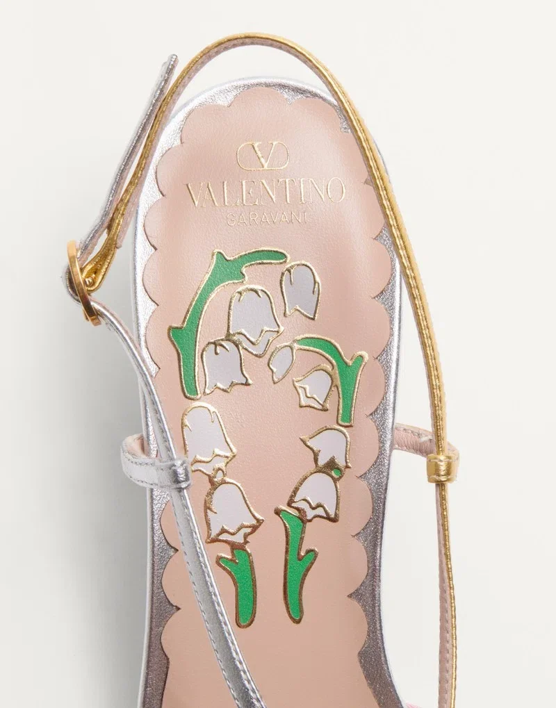 - VLogo Signature detail in antique-effect brass finish on heel