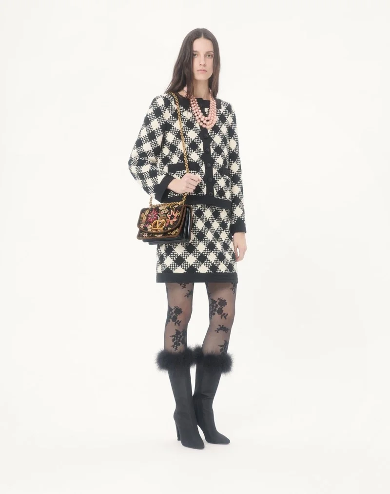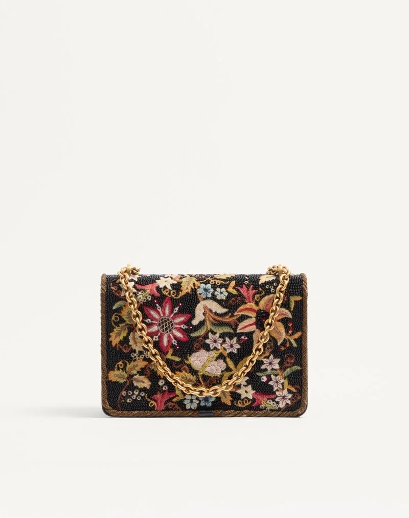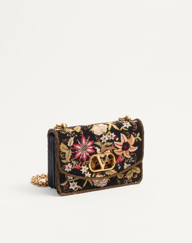 Valentino Garavani Vain shoulder bag with floral embroidery on a black beaded base and metallic VLogo Signature detail. The bag can be carried on the shoulder/crossbody thanks to the sliding chain.