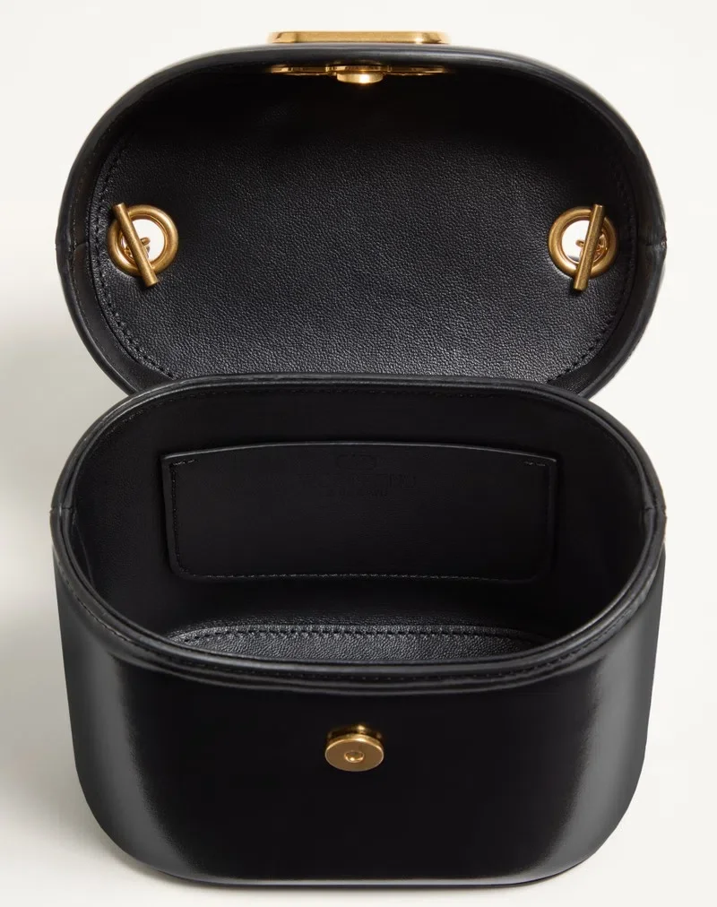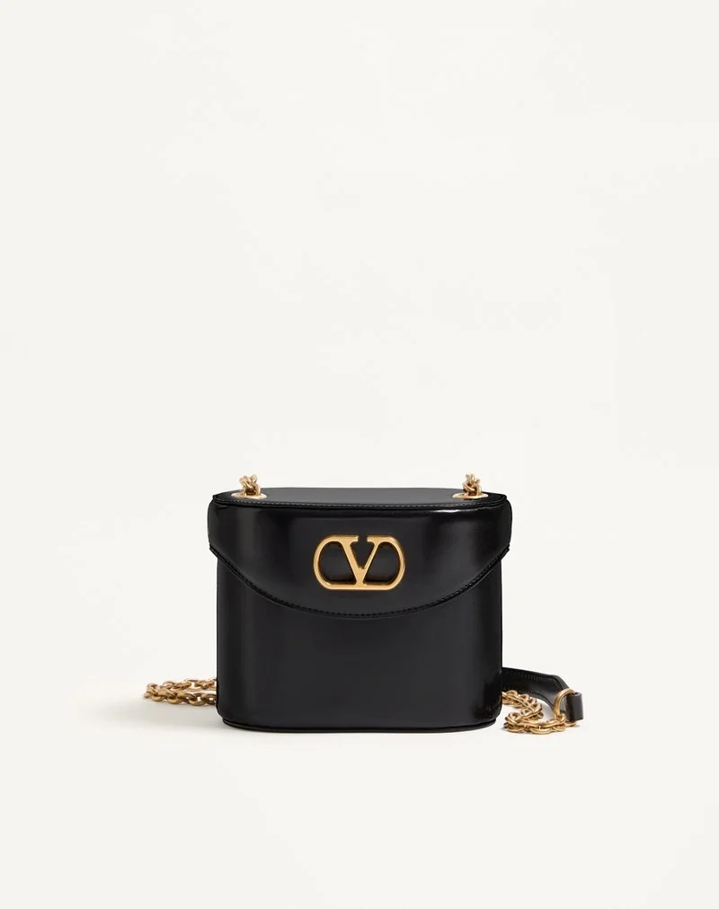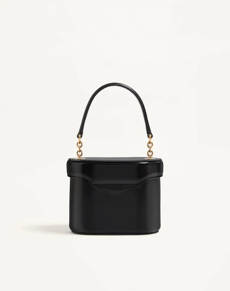 Valentino Garavani Vain vanity bag in shiny calfskin with metallic VLogo Signature detail. The bag can be carried by hand using the handle or worn crossbody using the chain, both of which are detachable.